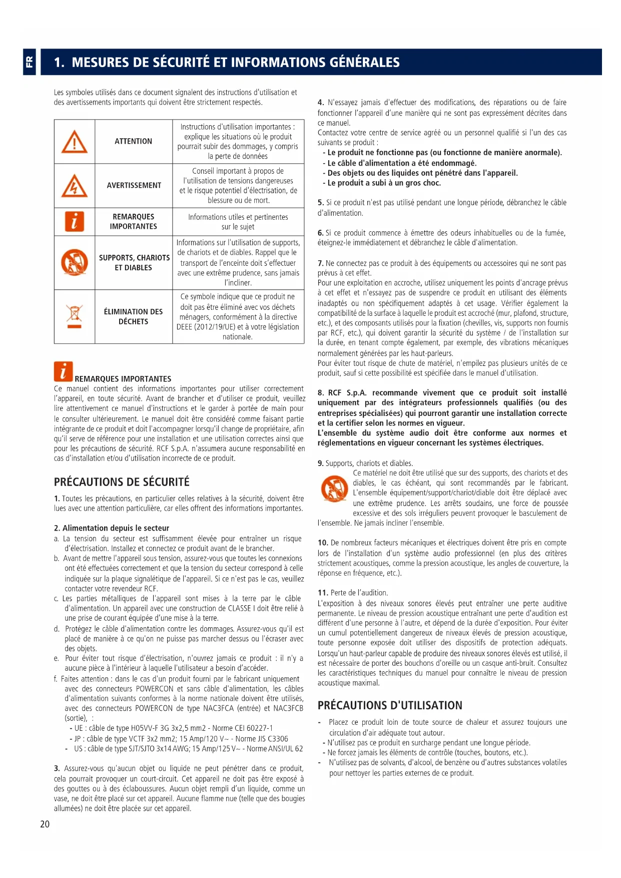 a. La tension du secteur est suffisamment élevée pour entraîner un risque d’électrisation. Installez et connectez ce produit avant de le brancher. b. Avant de mettre l'appareil sous tension, assurez-vous que toutes les connexions ont été effectuées correctement et que la tension du secteur correspond à celle indiquée sur la plaque signalétique de l'appareil. Si ce n'est pas le cas, veuillez contacter votre revendeur RCF. c. Les parties métalliques de l'appareil sont mises à la terre par le câble d'alimentation. Un appareil avec une construction de CLASSE I doit être relié à une prise de courant équipée d’une mise à la terre. d. Protégez le câble d'alimentation contre les dommages. Assurez-vous qu'il est placé de manière à ce qu'on ne puisse pas marcher dessus ou l'écraser avec des objets. e. Pour éviter tout risque d’électrisation, n'ouvrez jamais ce produit : il n'y a aucune pièce à l'intérieur à laquelle l'utilisateur a besoin d’accéder. f. Faites attention: dans le cas d'un produit fourni par le fabricant uniquement avec des connecteurs POWERCON et sans câble d'alimentation, les câbles d'alimentation suivants conformes à la norme nationale doivent être utilisés, avec des connecteurs POWERCON de type NAC3FCA (entrée) et NAC3FCB (sortie), : - UE: câble de type H05VV-F 3G 3x2,5mm2 - Norme CEI 60227-1 - JP: câble de type VCTF 3x2mm2; 15Amp/120V~ - Norme JIS C3306 - US: câble de type SJT/SJTO 3x14 AWG; 15Amp/125V~ - Norme ANSI/UL 62