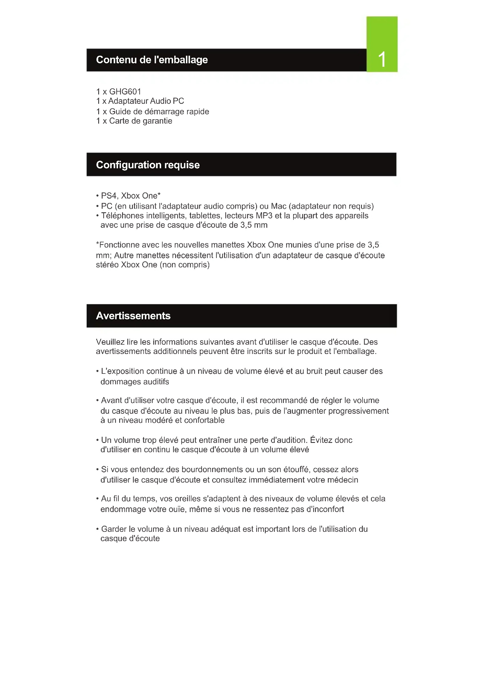 - Téléphones intelligents, tablettes, lecteurs MP3 et la plupart des appareils avec une prise de casque d'écoute de 3,5 mm *Fonctionne avec les nouvelles manettes Xbox One munies d'une prise de 3,5 mm; Autre manettes nécessitent l'utilisation d'un adaptateur de casque d'écoute stéréo Xbox One (non compris) Configuration requise Avertissements Veuillez lire les informations suivantes avant d'utiliser le casque d'écoute. Des avertissements additionnels peuvent être inscrits sur le produit et l'emballage.