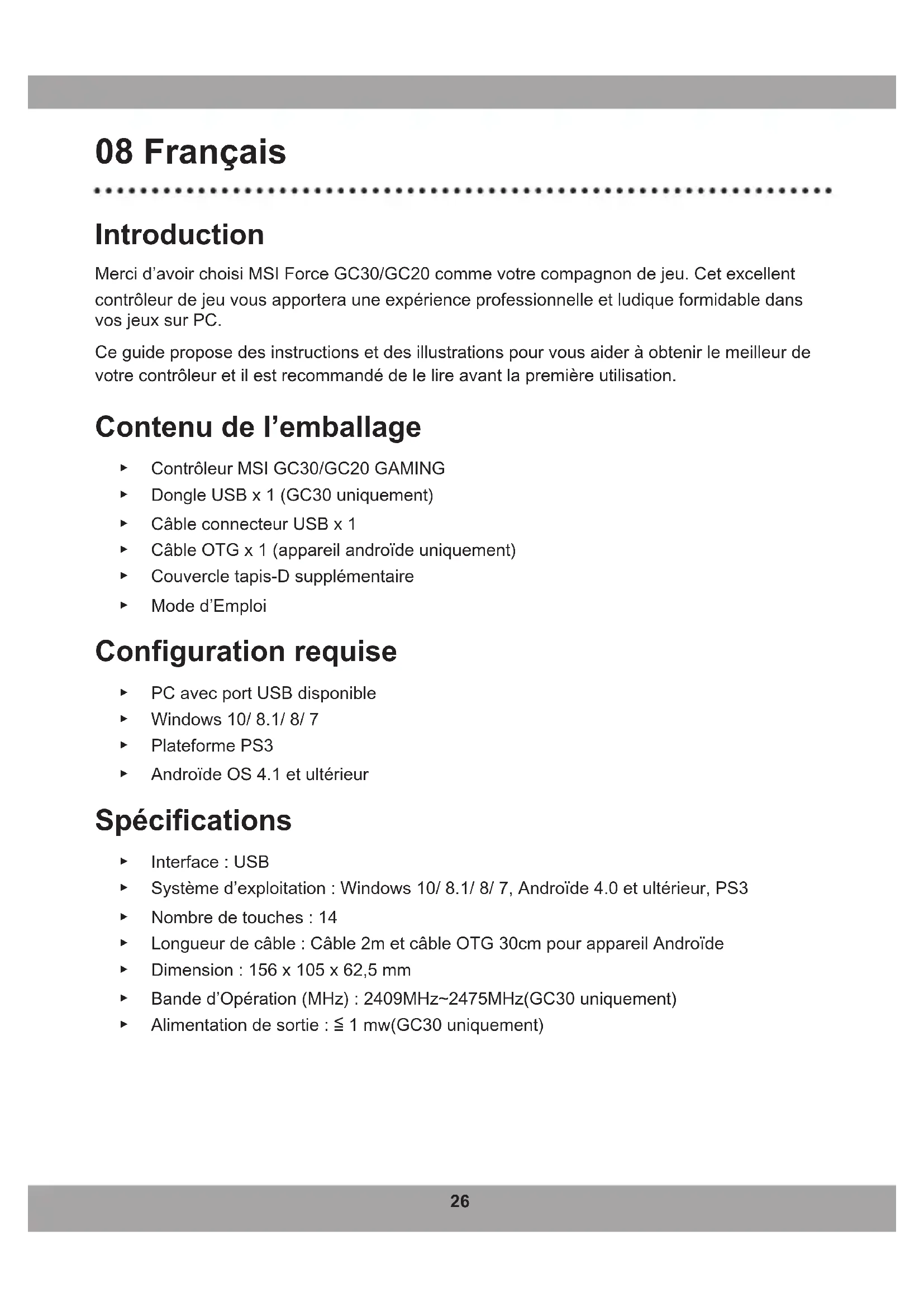- ĐènLEDchỉbáoChếđộ3và4sẽsángkhichếđộnàyđượcchọn.26 08 Français Introduction Merci d’avoir choisi MSI Force GC30/GC20 comme votre compagnon de jeu. Cet excellent contrôleurdejeuvousapporterauneexpérienceprofessionnelleetludiqueformidabledans vos jeux sur PC. Ceguideproposedesinstructionsetdesillustrationspourvousaideràobtenirlemeilleurde votrecontrôleuretilestrecommandédelelireavantlapremièreutilisation. Contenu de l’emballage ▶ ContrôleurMSIGC30/GC20GAMING ▶ Dongle USB x 1 (GC30 uniquement) ▶ CâbleconnecteurUSBx1 ▶ CâbleOTGx1(appareilandroïdeuniquement) ▶ Couvercletapis-Dsupplémentaire ▶ Mode d’Emploi Configuration requise ▶ PC avec port USB disponible ▶ Windows 10/ 8.1/ 8/ 7 ▶ Plateforme PS3 ▶ AndroïdeOS4.1etultérieur Spécifications ▶ Interface : USB ▶ Systèmed’exploitation:Windows10/8.1/8/7,Androïde4.0etultérieur,PS3 ▶ Nombre de touches : 14 ▶ Longueurdecâble:Câble2metcâbleOTG30cmpourappareilAndroïde ▶ Dimension : 156 x 105 x 62,5 mm ▶ Banded’Opération(MHz):2409MHz~2475MHz(GC30uniquement) ▶ Alimentationdesortie:≦1mw(GC30uniquement)27 Vue d’ensemble