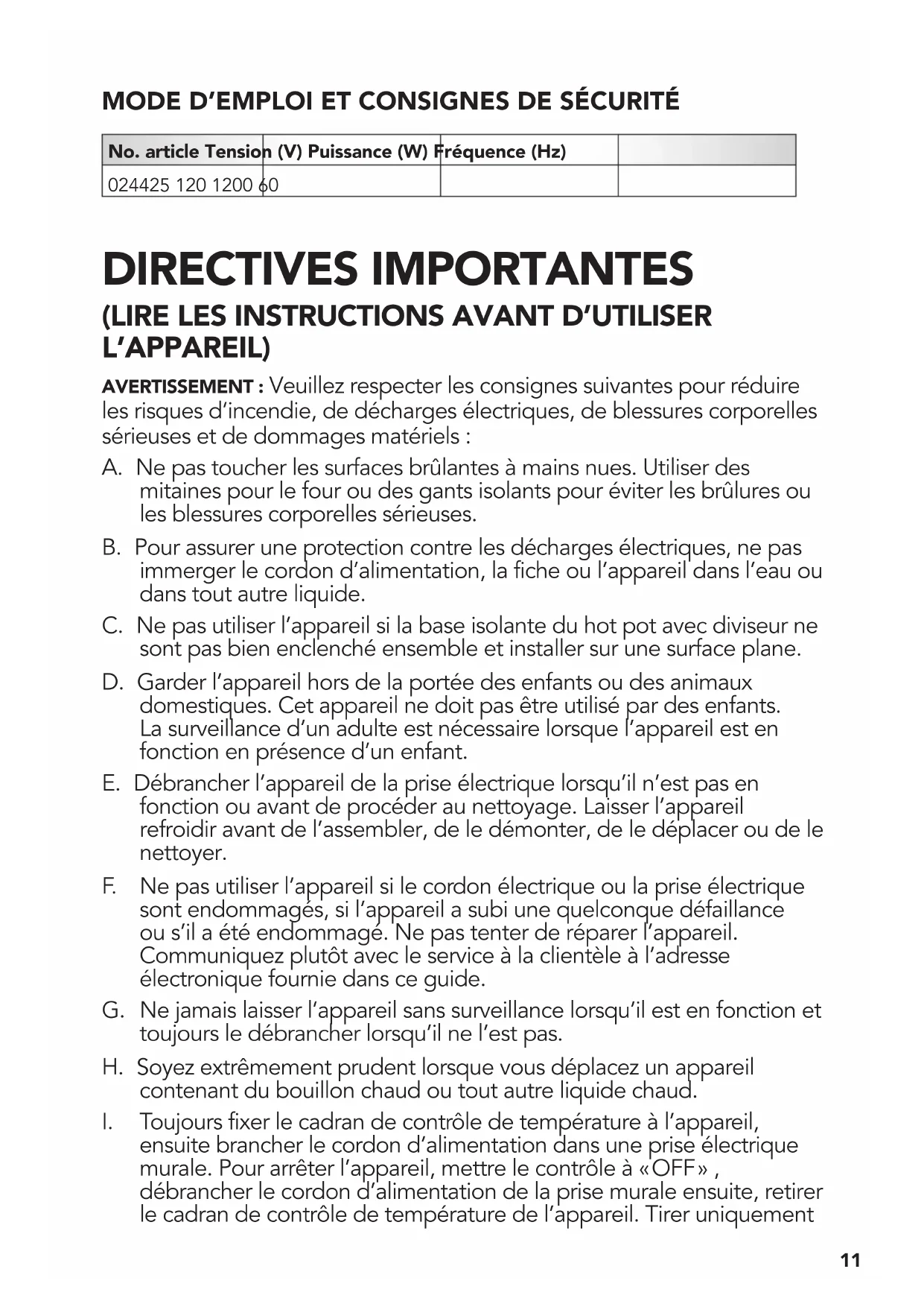 les risques d’incendie, de décharges électriques, de blessures corporelles sérieuses et de dommages matériels : A. Ne pas toucher les surfaces brûlantes à mains nues. Utiliser des mitaines pour le four ou des gants isolants pour éviter les brûlures ou les blessures corporelles sérieuses. B. Pour assurer une protection contre les décharges électriques, ne pas immerger le cordon d’alimentation, la fiche ou l’appareil dans l’eau ou dans tout autre liquide. C. Ne pas utiliser l’appareil si la base isolante du hot pot avec diviseur ne sont pas bien enclenché ensemble et installer sur une surface plane. D. Garder l’appareil hors de la portée des enfants ou des animaux domestiques. Cet appareil ne doit pas être utilisé par des enfants. La surveillance d’un adulte est nécessaire lorsque l’appareil est en fonction en présence d’un enfant. E. Débrancher l’appareil de la prise électrique lorsqu’il n’est pas en fonction ou avant de procéder au nettoyage. Laisser l’appareil refroidir avant de l’assembler, de le démonter, de le déplacer ou de le nettoyer. F. Ne pas utiliser l’appareil si le cordon électrique ou la prise électrique sont endommagés, si l’appareil a subi une quelconque défaillance ou s’il a été endommagé. Ne pas tenter de réparer l’appareil. Communiquez plutôt avec le service à la clientèle à l’adresse électronique fournie dans ce guide. G. Ne jamais laisser l’appareil sans surveillance lorsqu’il est en fonction et toujours le débrancher lorsqu’il ne l’est pas. H. Soyez extrêmement prudent lorsque vous déplacez un appareil contenant du bouillon chaud ou tout autre liquide chaud.
