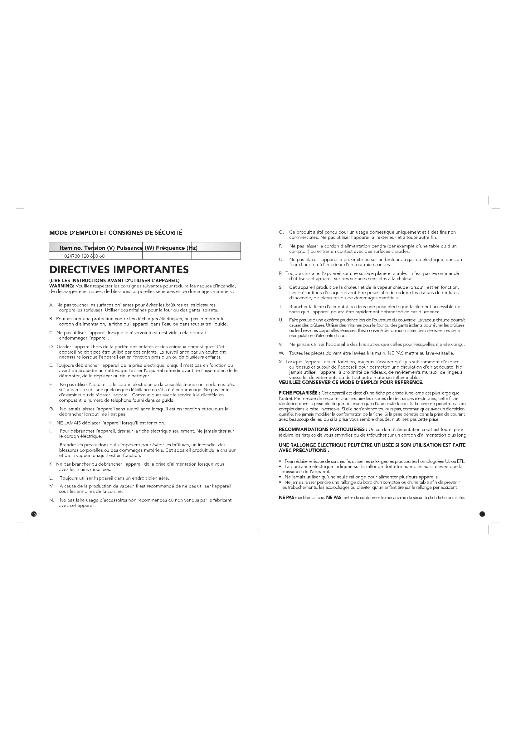 le cordon électrique. J. Prendre les précautions qui s’imposent pour éviter les brûlures, un incendie, des blessures corporelles ou des dommages matériels. Cet appareil produit de la chaleur et de la vapeur lorsqu’il est en fonction. K. Ne pas brancher ou débrancher l’appareil de la prise d’alimentation lorsque vous avez les mains mouillées. L. Toujours utiliser l’appareil dans un endroit bien aéré. M. À cause de la production de vapeur, il est recommandé de ne pas utiliser l’appareil sous les armoires de la cuisine. N. Ne pas faire usage d’accessoires non recommandés ou non vendus par le fabricant avec cet appareil. O. Ce produit a été conçu pour un usage domestique uniquement et à des ns non commerciales. Ne pas utiliser l’appareil à l’extérieur et à toute autre n. P. Ne pas laisser le cordon d’alimentation pendre (par exemple d’une table ou d’un comptoir) ou entrer en contact avec des surfaces chaudes. Q. Ne pas placer l’appareil à proximité ou sur un brûleur au gaz ou électrique, dans un four chaud ou à l’intérieur d’un four micro-ondes. R. Toujours installer l’appareil sur une surface plane et stable. Il n’est pas recommandé d’utiliser cet appareil sur des surfaces sensibles à la chaleur. S. Cet appareil produit de la chaleur et de la vapeur chaude lorsqu’il est en fonction. Les précautions d’usage doivent être prises an de réduire les risques de brûlures, d’incendie, de blessures ou de dommages matériels. T. Brancher la che d’alimentation dans une prise électrique facilement accessible de sorte que l’appareil pourra être rapidement débranché en cas d’urgence. U. Faire preuve d’une extrême prudence lors de l’ouverture du couvercle. La vapeur chaude pourrait causer des brûlures. Utiliser des mitaines pour le four ou des gants isolants pour éviter les brûlures ou les blessures corporelles sérieuses. Il est conseillé de toujours utiliser des ustensiles lors de la manipulation d’aliments chauds
