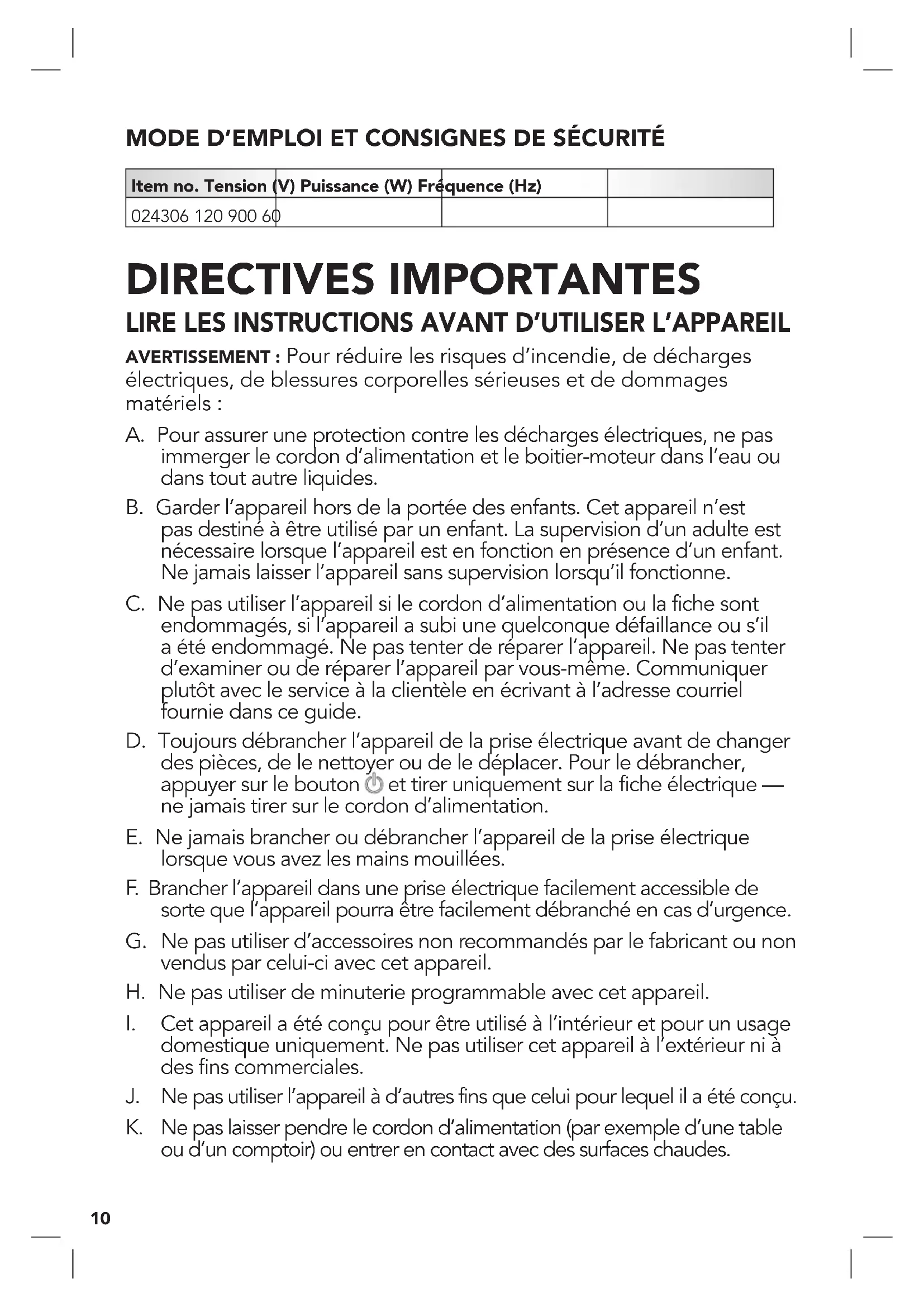 électriques, de blessures corporelles sérieuses et de dommages matériels : A. Pour assurer une protection contre les décharges électriques, ne pas immerger le cordon d’alimentation et le boitier-moteur dans l’eau ou dans tout autre liquides. B. Garder l’appareil hors de la portée des enfants. Cet appareil n’est pas destiné à être utilisé par un enfant. La supervision d’un adulte est nécessaire lorsque l’appareil est en fonction en présence d’un enfant. Ne jamais laisser l’appareil sans supervision lorsqu’il fonctionne. C. Ne pas utiliser l’appareil si le cordon d’alimentation ou la fiche sont endommagés, si l’appareil a subi une quelconque défaillance ou s’il a été endommagé. Ne pas tenter de réparer l’appareil. Ne pas tenter d’examiner ou de réparer l’appareil par vous-même. Communiquer plutôt avec le service à la clientèle en écrivant à l’adresse courriel fournie dans ce guide. D. Toujours débrancher l’appareil de la prise électrique avant de changer des pièces, de le nettoyer ou de le déplacer. Pour le débrancher, appuyer sur le bouton et tirer uniquement sur la fiche électrique — ne jamais tirer sur le cordon d’alimentation. E. Ne jamais brancher ou débrancher l’appareil de la prise électrique lorsque vous avez les mains mouillées. F. Brancher l’appareil dans une prise électrique facilement accessible de sorte que l’appareil pourra être facilement débranché en cas d’urgence. G. Ne pas utiliser d’accessoires non recommandés par le fabricant ou non vendus par celui-ci avec cet appareil. H. Ne pas utiliser de minuterie programmable avec cet appareil.