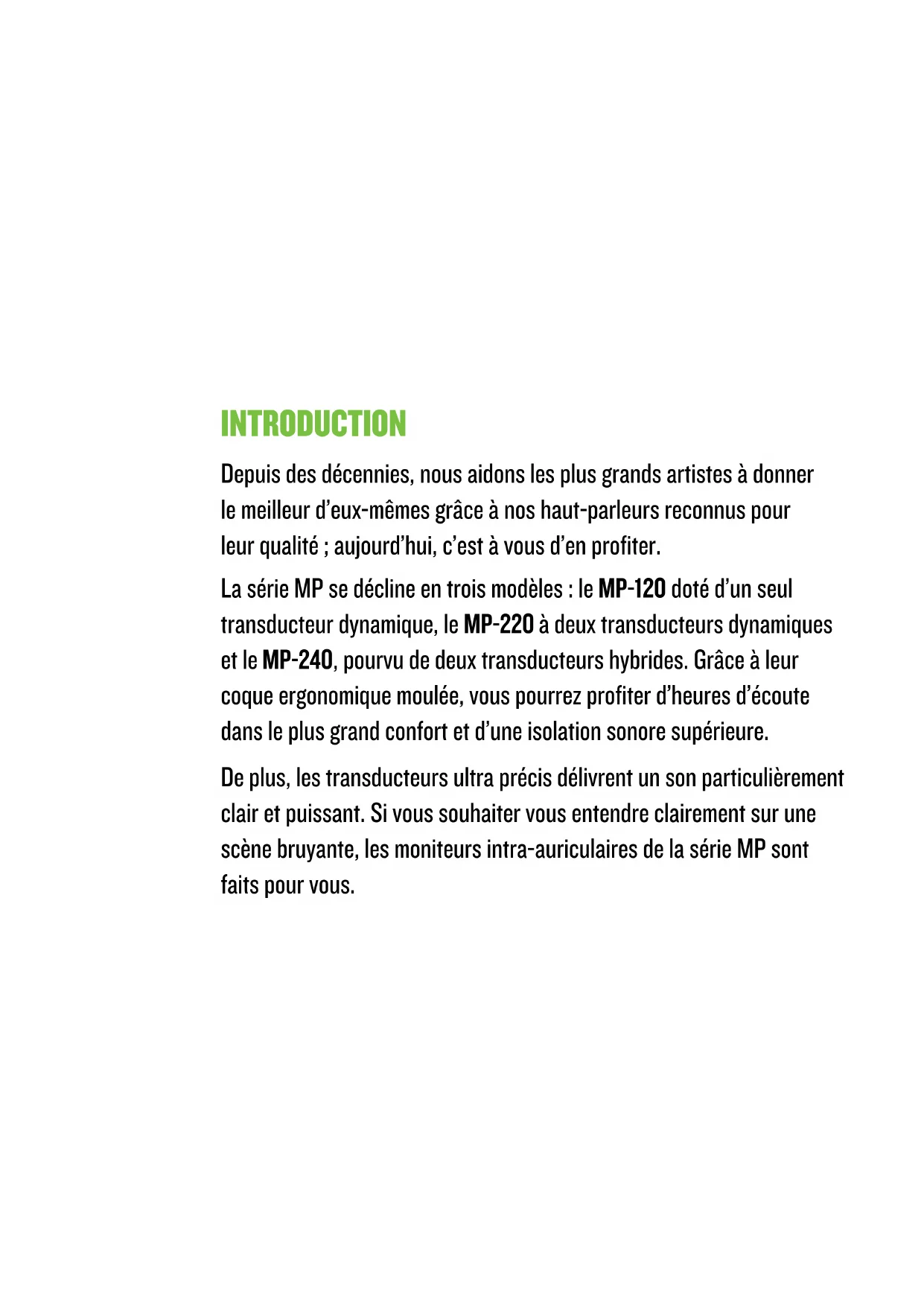 - Les moniteurs intra-auriculaires MP-220 garantissent les performances, la clarté et le confort nécessaires pour que les artistes puissent donner le meilleur d’eux-mêmes