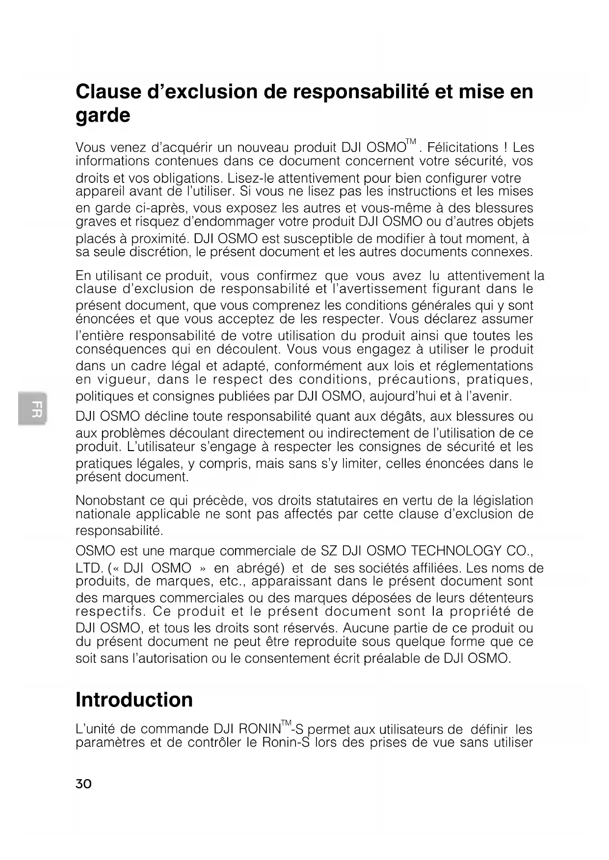 . Félicitations ! Les informations contenues dans ce document concernent votre sécurité, vos droits et vos obligations. Lisez-le attentivement pour bien congurer votre appareil avant de l’utiliser. Si vous ne lisez pas les instructions et les mises en garde ci-après, vous exposez les autres et vous-même à des blessures graves et risquez d’endommager votre produit DJI OSMO ou d’autres objets placés à proximité. DJI OSMO est susceptible de modier à tout moment, à sa seule discrétion, le présent document et les autres documents connexes. En utilisant ce produit, vous conrmez que vous avez lu attentivement la clause d’exclusion de responsabilité et l’avertissement figurant dans le présent document, que vous comprenez les conditions générales qui y sont énoncées et que vous acceptez de les respecter. Vous déclarez assumer l’entière responsabilité de votre utilisation du produit ainsi que toutes les conséquences qui en découlent. Vous vous engagez à utiliser le produit dans un cadre légal et adapté, conformément aux lois et réglementations en vigueur, dans le respect des conditions, précautions, pratiques, politiques et consignes publiées par DJI OSMO, aujourd’hui et à l’avenir. DJI OSMO décline toute responsabilité quant aux dégâts, aux blessures ou aux problèmes découlant directement ou indirectement de l’utilisation de ce produit. L’utilisateur s’engage à respecter les consignes de sécurité et les pratiques légales, y compris, mais sans s’y limiter, celles énoncées dans le présent document. Nonobstant ce qui précède, vos droits statutaires en vertu de la législation nationale applicable ne sont pas affectés par cette clause d’exclusion de responsabilité. OSMO est une marque commerciale de SZ DJI OSMO TECHNOLOGY CO., LTD. (« DJI OSMO » en abrégé) et de ses sociétés afliées. Les noms de produits, de marques, etc., apparaissant dans le présent document sont des marques commerciales ou des marques déposées de leurs détenteurs respectifs. Ce produit et le présent document sont la propriété de DJI OSMO, et tous les droits sont réservés. Aucune partie de ce produit ou du présent document ne peut être reproduite sous quelque forme que ce soit sans l’autorisation ou le consentement écrit préalable de DJI OSMO. Introduction L’unité de commande DJI RONIN
