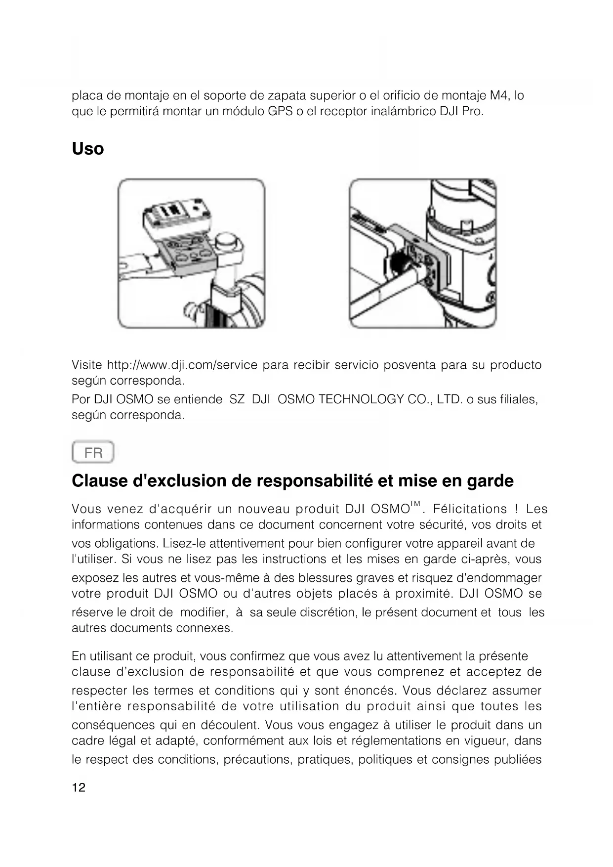 -S est dotée d'orifices de 1/4"-20. Fixez la plaque perforée sur le support du pied-sabot ou sur l'orice de xation M4, ce qui vous permettra de xer un module GPS ou le récepteur sans l DJI Pro. Utilisation Si nécessaire, rendez-vous sur la page http://www.dji.com/service pour bénécier du service après-vente pour votre produit. DJI OSMO signifie SZ DJI OSMO TECHNOLOGY CO., LTD. et/ou ses sociétés afliées le cas échéant.14