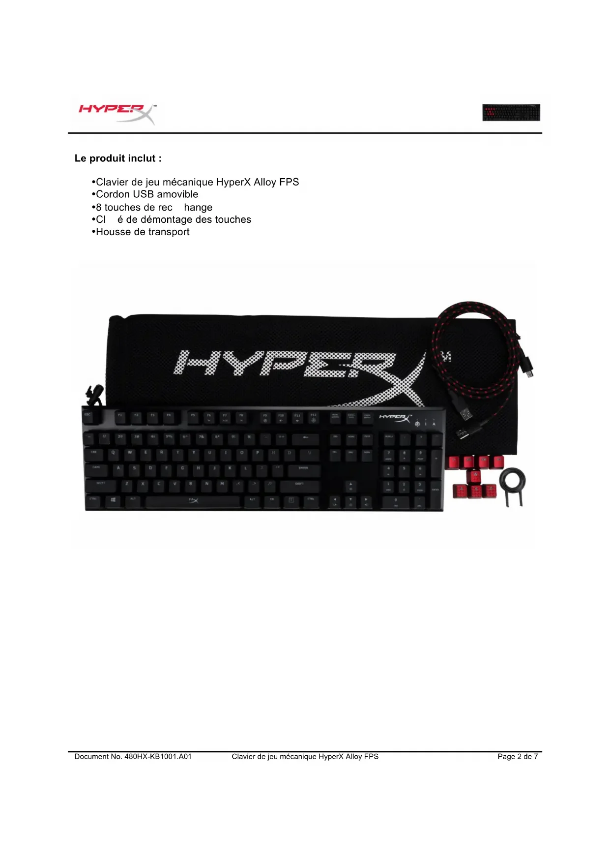 - Housse de transportDocument No. 480HX-KB1001.A01 Clavier de jeu mécanique HyperX Alloy FPS Page 3 de 7 Présentation du clavier : A- F6 F7 F8 = Touches médias. B- F9 F10 F11 = Touches de réglage du volume. C- F12 = Touche d'activation du mode Jeu. D- Témoins lumineux : Mode Jeu / Verrouillage du clavier numérique / Verrouillage de la touche Majuscule. E- Gauche & Droite = Touches de contrôle du mode LED. F- Haut & Bas = Touches de réglage de la luminosité LED. G- Port USB arrière = Port de chargement USB pour téléphone portable. H- Port Mini USB arrière = Port de connexion pour câble de clavier USB.Document No. 480HX-KB1001.A01 Clavier de jeu mécanique HyperX Alloy FPS Page 4 de 7 Installation du clavier :