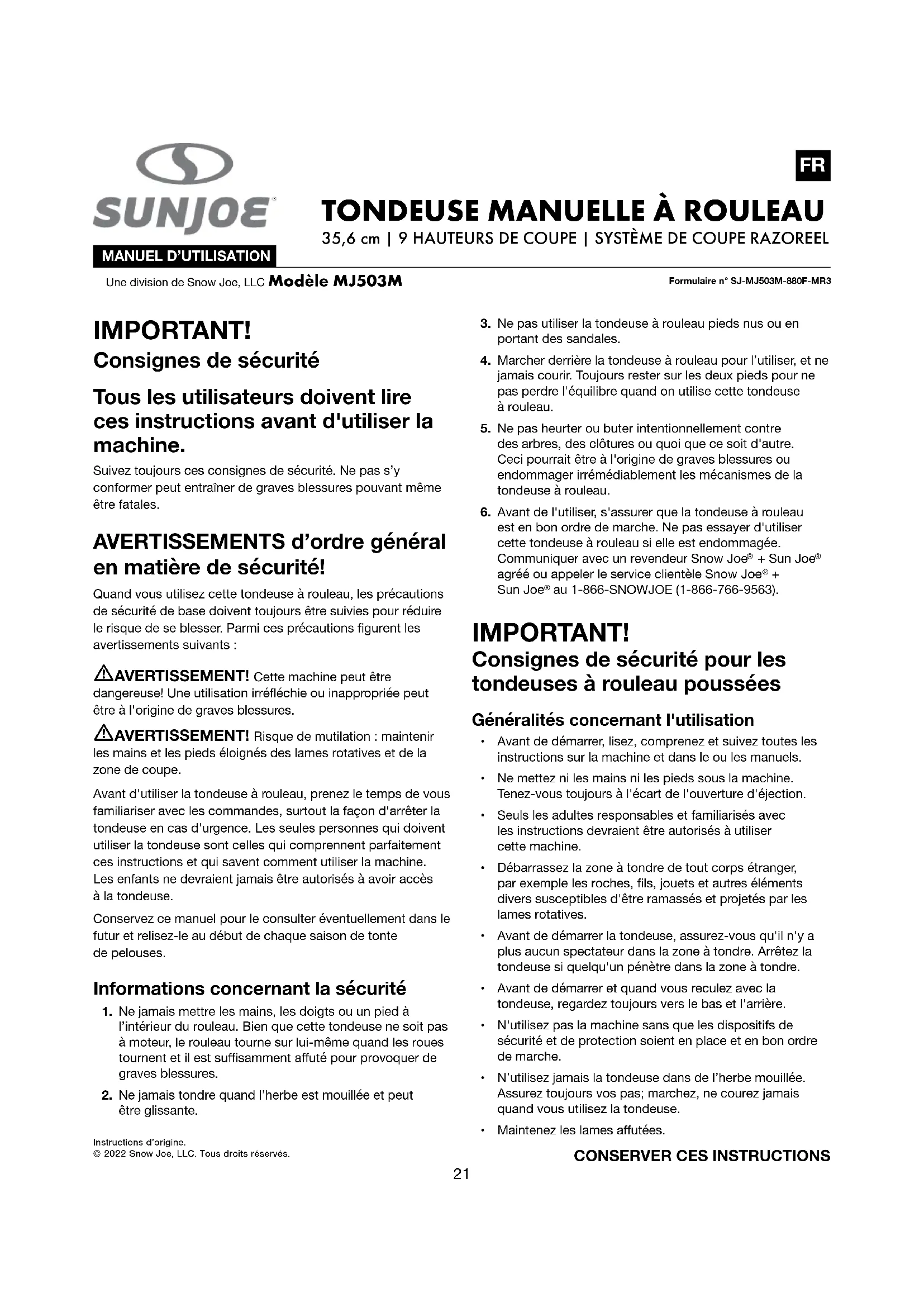 35,6 cm | 9 HAUTEURS DE COUPE | SYSTÈME DE COUPE RAZOREEL Instructions d’origine.© 2022 Snow Joe, LLC. Tous droits réservés. IMPORTANT! Consignes de sécurité Tous les utilisateurs doivent lire ces instructions avant d'utiliser la machine. Suivez toujours ces consignes de sécurité. Ne pas s’y conformer peut entraîner de graves blessures pouvant même être fatales. AVERTISSEMENTS d’ordre général en matière de sécurité! Quand vous utilisez cette tondeuse à rouleau, les précautions de sécurité de base doivent toujours être suivies pour réduire le risque de se blesser. Parmi ces précautions gurent les avertissements suivants : mAVERTISSEMENT! Cette machine peut être dangereuse! Une utilisation irrééchie ou inappropriée peut être à l'origine de graves blessures. mAVERTISSEMENT! Risque de mutilation : maintenir les mains et les pieds éloignés des lames rotatives et de la zone de coupe. Avant d'utiliser la tondeuse à rouleau, prenez le temps de vous familiariser avec les commandes, surtout la façon d'arrêter la tondeuse en cas d'urgence. Les seules personnes qui doivent utiliser la tondeuse sont celles qui comprennent parfaitement ces instructions et qui savent comment utiliser la machine. Les enfants ne devraient jamais être autorisés à avoir accès à la tondeuse. Conservez ce manuel pour le consulter éventuellement dans le futur et relisez-le au début de chaque saison de tonte de pelouses. Informations concernant la sécurité