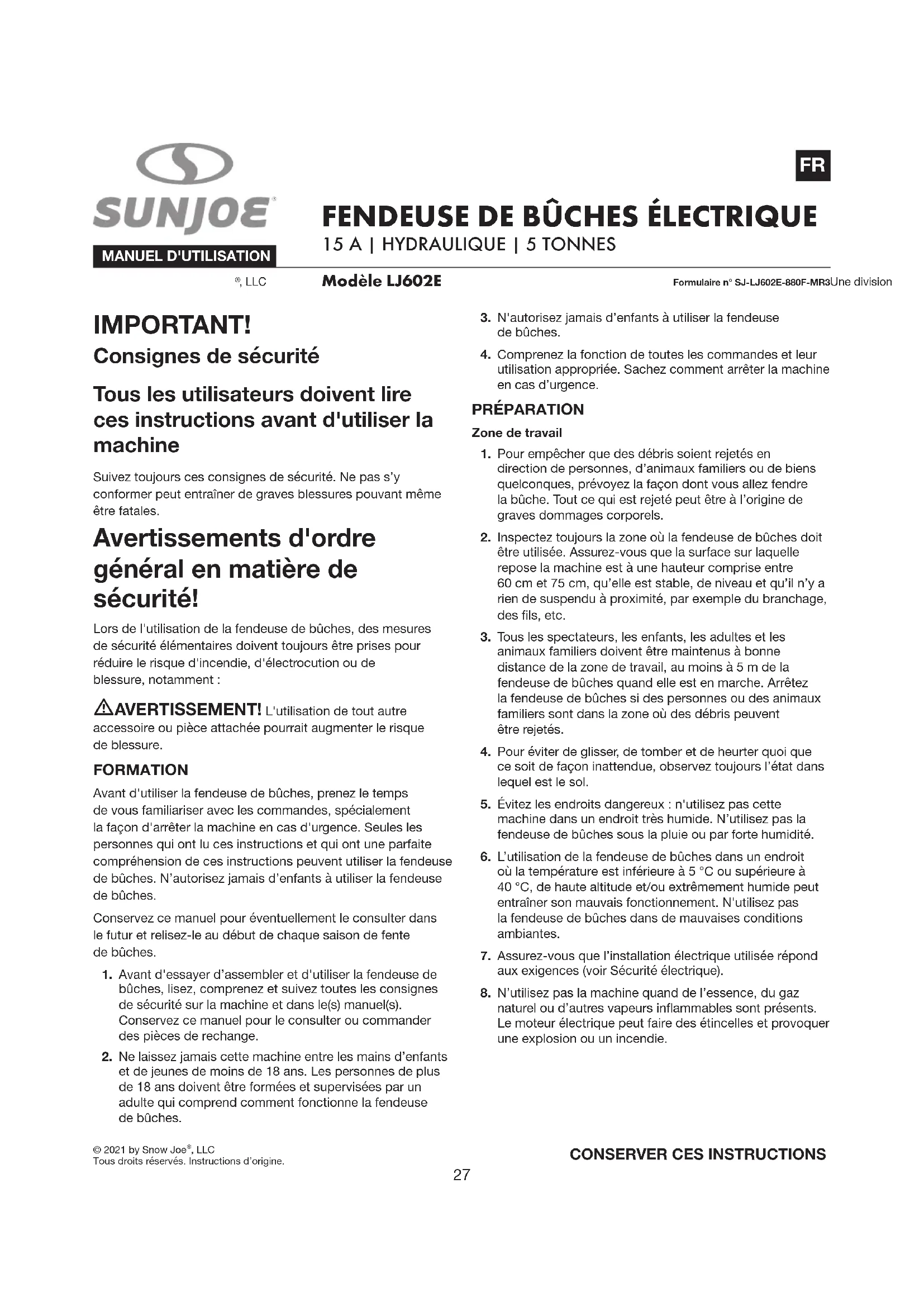 Retrouvez gratuitement la notice de l'appareil LJ602E Sun Joe au format PDF.