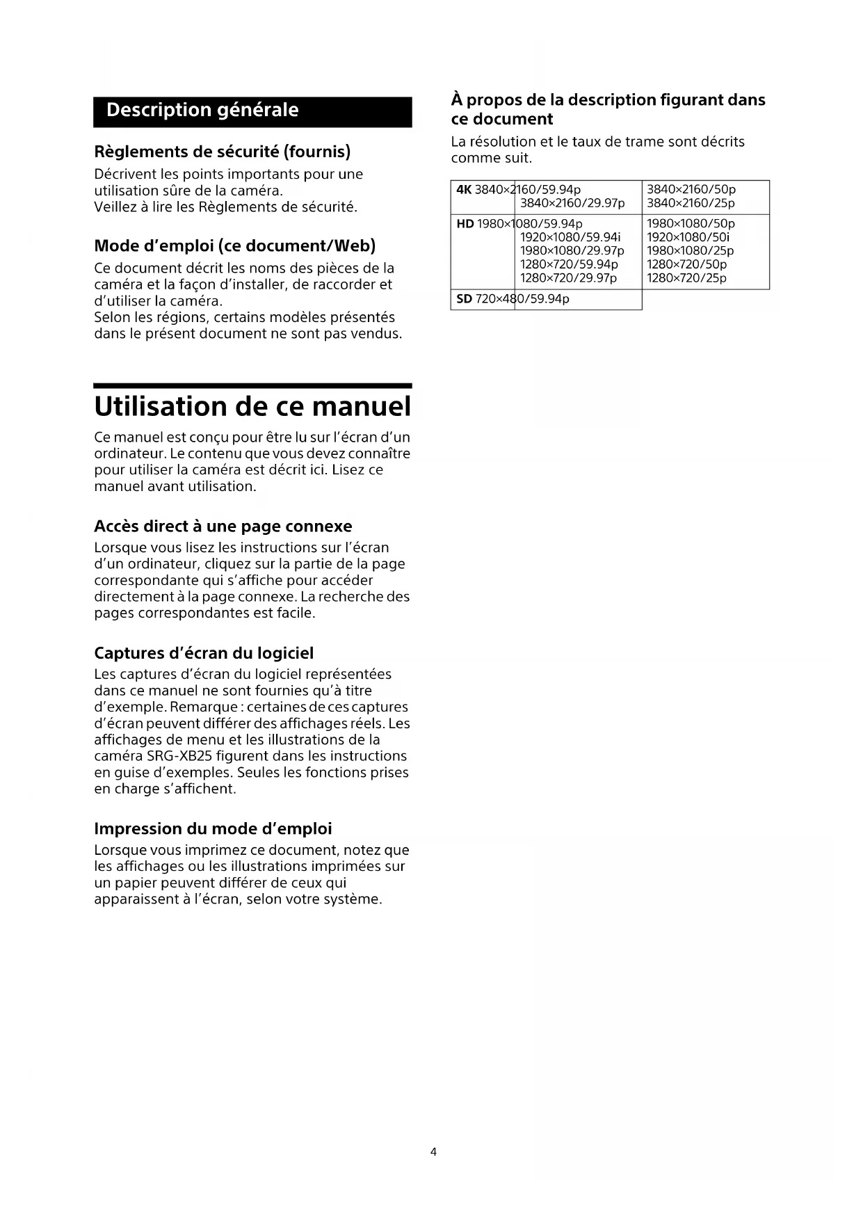 - Color Video Camera Mode d’emploi Version de logiciel 1.20 Avant d’utiliser l’appareil, veuillez lire attentivement ce manuel et le conserver pour future référence. SRG-XP1 SRG-XB25 F-192-100-23 (1) © 2020 Sony Corporation2 Table des matières Description générale Utilisation de ce manuel p. 4