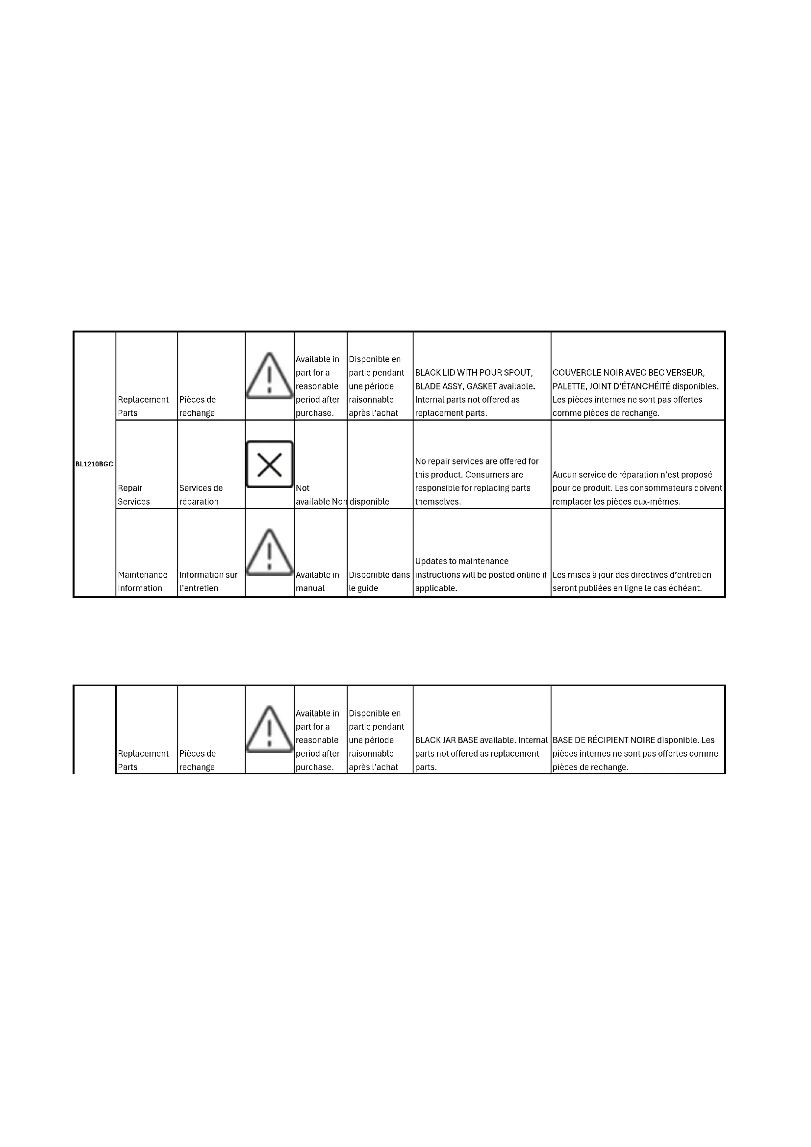 FRITURE 8 PTE AVEC POIGNÉE disponibles. Les pièces internes ne sont pas offertes comme pièces de rechange. Repair Services Services de réparation Not available Non disponible No repair services are offered for this product. Consumers are responsible for replacing parts themselves. Aucun service de réparation n’est proposé pour ce produit. Les consommateurs doivent remplacer les pièces eux-mêmes. Maintenance Information Information sur l’entretien Available in manual Disponible dans le guide Updates to maintenance instructions will be posted online if applicable. Les mises à jour des directives d’entretien seront publiées en ligne le cas échéant. AFBD82- 2BDCReplacement Parts Pièces de rechange Available in part for a reasonable period after purchase. Disponible en partie pendant une période raisonnable après l’achat BLACK LID WITH POUR SPOUT, BLADE ASSY, GASKET available. Internal parts not offered as replacement parts. COUVERCLE NOIR AVEC BEC VERSEUR, PALETTE, JOINT D’ÉTANCHÉITÉ disponibles. Les pièces internes ne sont pas offertes comme pièces de rechange. Repair Services Services de réparation Not available Non disponible No repair services are offered for this product. Consumers are responsible for replacing parts themselves. Aucun service de réparation n’est proposé pour ce produit. Les consommateurs doivent remplacer les pièces eux-mêmes. Maintenance Information Information sur l’entretien Available in manual Disponible dans le guide Updates to maintenance instructions will be posted online if applicable. Les mises à jour des directives d’entretien seront publiées en ligne le cas échéant. Replacement Parts Pièces de rechange Available in part for a reasonable period after purchase. Disponible en partie pendant une période raisonnable après l’achat BLACK JAR BASE available. Internal parts not offered as replacement parts. BASE DE RÉCIPIENT NOIRE disponible. Les pièces internes ne sont pas offertes comme pièces de rechange. BL1210BGC BL1220SGCRepair Services Services de réparation Not available Non disponible No repair services are offered for this product. Consumers are responsible for replacing parts themselves. Aucun service de réparation n’est proposé pour ce produit. Les consommateurs doivent remplacer les pièces eux-mêmes. Maintenance Information Information sur l’entretien Available in manual Disponible dans le guide Updates to maintenance instructions will be posted online if applicable. Les mises à jour des directives d’entretien seront publiées en ligne le cas échéant. Replacement Parts Pièces de rechange Available in part for a reasonable period after purchase. Disponible en partie pendant une période raisonnable après l’achat Blending jar available. Internal parts not offered as replacement parts Pot de mélange disponible. Les pièces internes ne sont pas offertes comme pièces de rechange. Repair Services Services de réparation Not available Non disponible No repair services are offered for this product. Consumers are responsible for replacing parts themselves. Aucun service de réparation n’est proposé pour ce produit. Les consommateurs doivent remplacer les pièces eux-mêmes. BL2010BGC BL1220SGCMaintenance Information Information sur l’entretien Available in manual Disponible dans le guide Updates to maintenance instructions will be posted online if applicable. Les mises à jour des directives d’entretien seront publiées en ligne le cas échéant. Replacement Parts Pièces de rechange Available in part for a reasonable period after purchase. Disponible en partie pendant une période raisonnable après l’achat