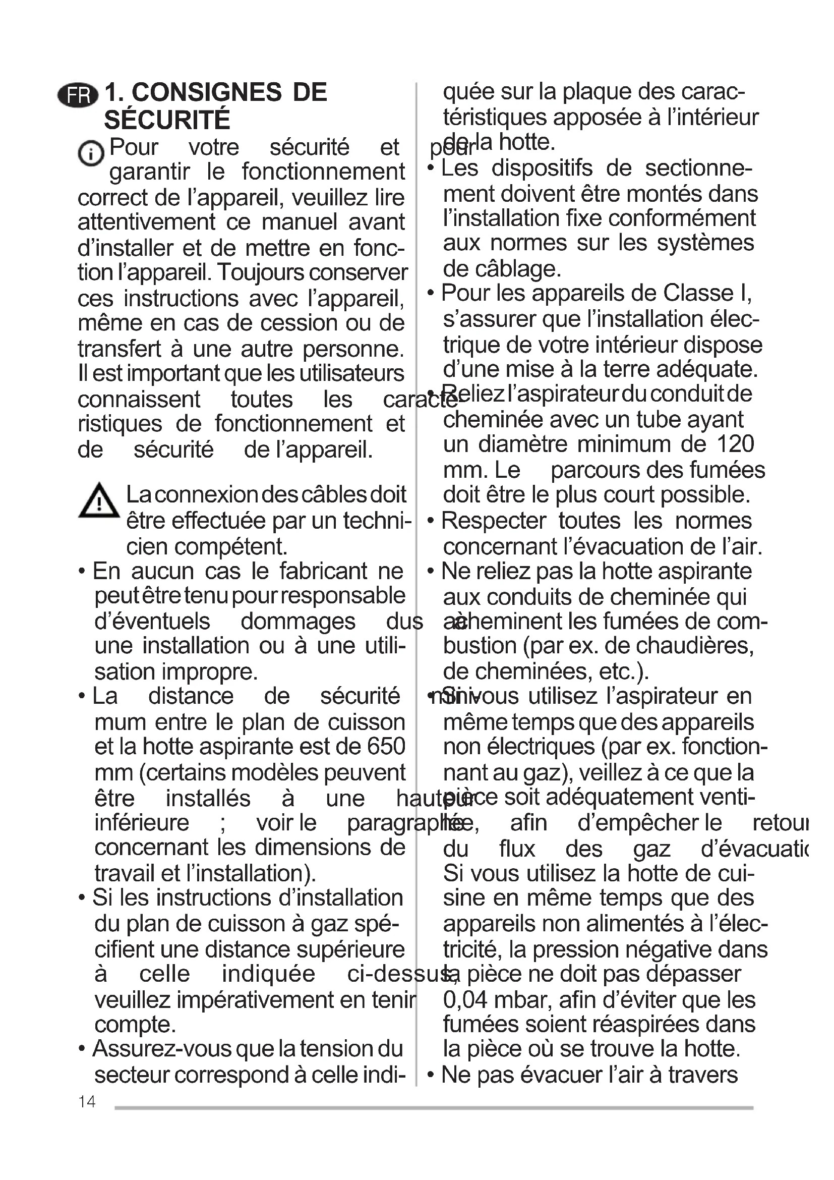- Si vous utilisez l’aspirateur en même temps que des appareils nonélectriques(parex.fonction- nant au gaz), veillez à ce que la piècesoitadéquatementventi- lée, an d’empêcherle retour du ux des gaz d’évacuation. Si vous utilisez la hotte de cui- sine en même temps que des appareilsnonalimentésàl’élec- tricité,lapressionnégativedans lapiècenedoitpasdépasser 0,04mbar,and’éviterqueles fuméessoientréaspiréesdans la pièce où se trouve la hotte.