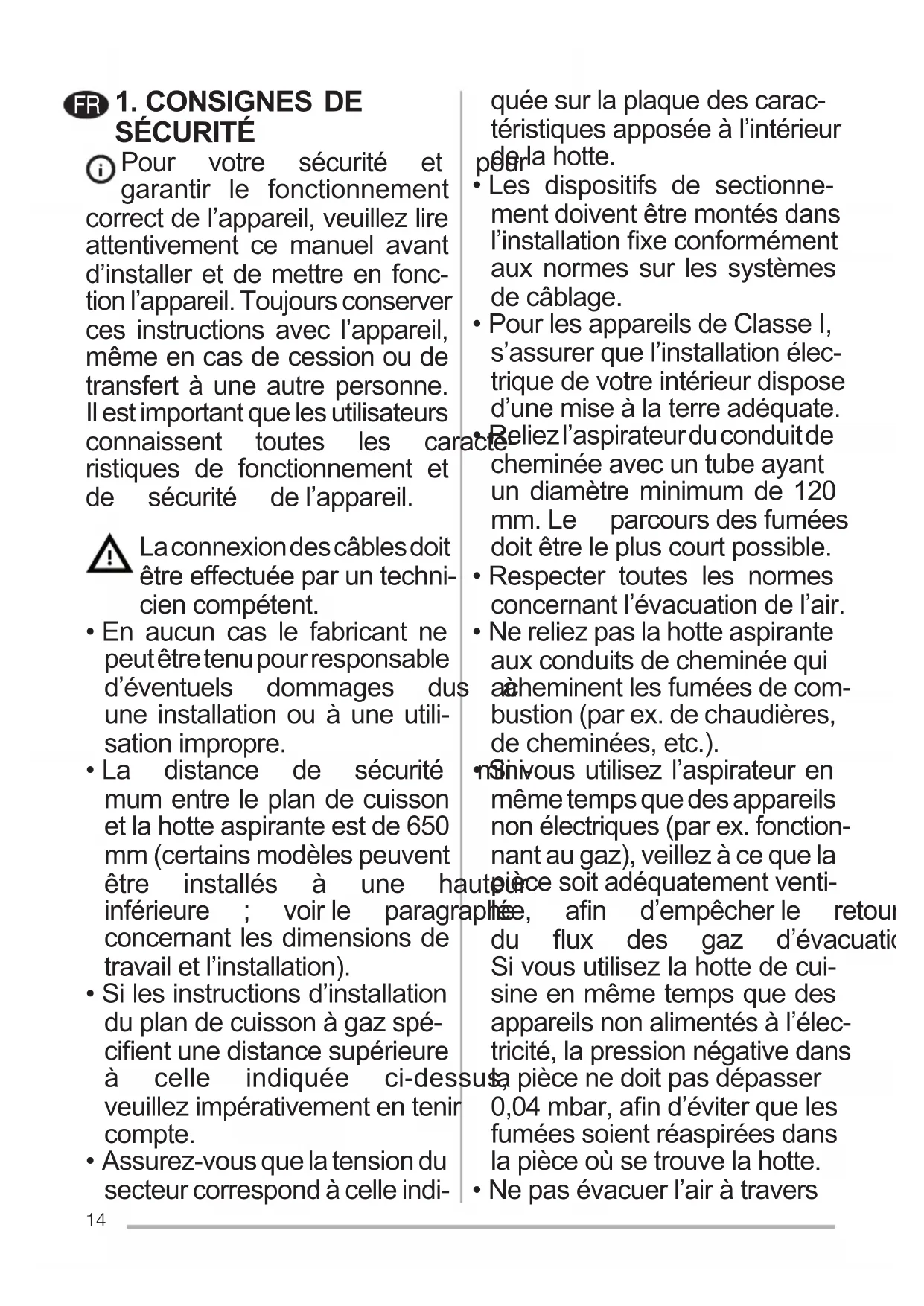 - Si vous utilisez l’aspirateur en même temps que des appareils nonélectriques(parex.fonction- nant au gaz), veillez à ce que la piècesoitadéquatementventi- lée, an d’empêcherle retour du ux des gaz d’évacuation. Si vous utilisez la hotte de cui- sine en même temps que des appareilsnonalimentésàl’élec- tricité,lapressionnégativedans lapiècenedoitpasdépasser 0,04mbar,and’éviterqueles fuméessoientréaspiréesdans la pièce où se trouve la hotte.