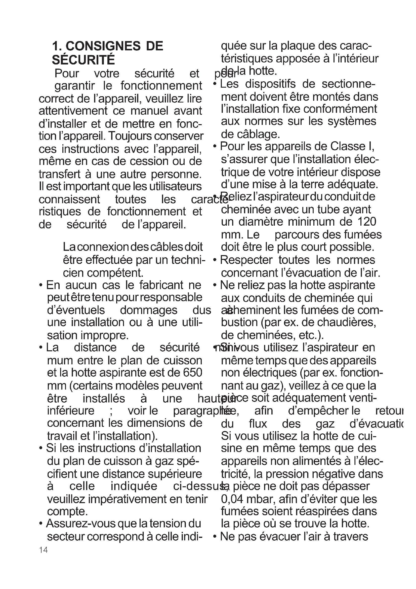 - Si vous utilisez l’aspirateur en même temps que des appareils nonélectriques(parex.fonction- nant au gaz), veillez à ce que la piècesoitadéquatementventi- lée, an d’empêcherle retour du ux des gaz d’évacuation. Si vous utilisez la hotte de cui- sine en même temps que des appareilsnonalimentésàl’élec- tricité,lapressionnégativedans lapiècenedoitpasdépasser 0,04mbar,and’éviterqueles fuméessoientréaspiréesdans la pièce où se trouve la hotte.