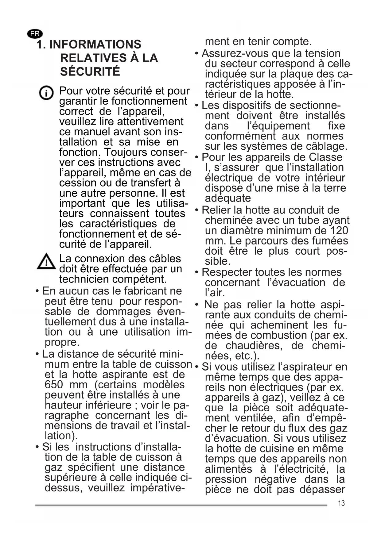 - En ce qui concerne les dimen- sions techniques et de sécuri- té à adopter pour l’évacuation des fumées, se conformer scrupuleusement aux règle- ments établis par les autorités locales. ATTENTION: avant d’ins- taller la hotte, retirer les films de protection.