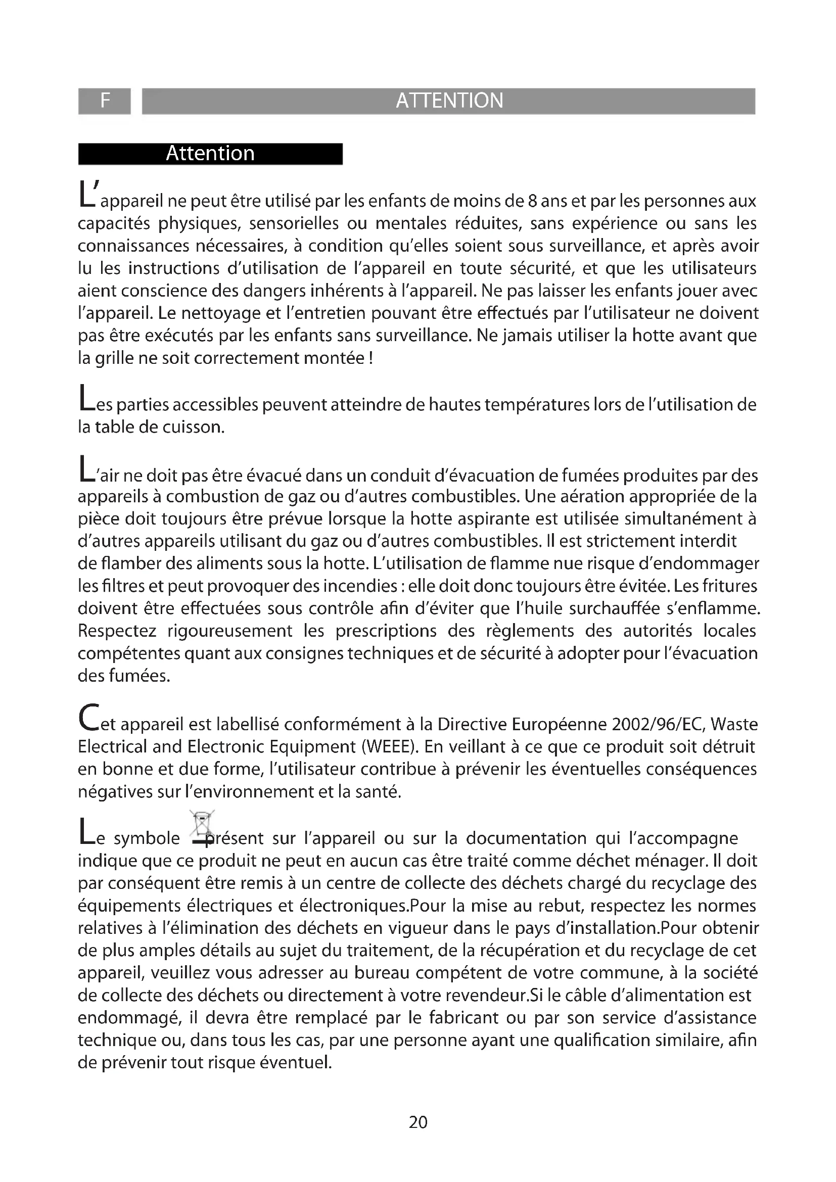 Attention ATTENTION L’appareil ne peut être utilisé par les enfants de moins de 8 ans et par les personnes aux capacités physiques, sensorielles ou mentales réduites, sans expérience ou sans les connaissances nécessaires, à condition qu’elles soient sous surveillance, et après avoir lu les instructions d’utilisation de l’appareil en toute sécurité, et que les utilisateurs aient conscience des dangers inhérents à l’appareil. Ne pas laisser les enfants jouer avec l’appareil. Le nettoyage et l’entretien pouvant être eectués par l’utilisateur ne doivent pas être exécutés par les enfants sans surveillance. Ne jamais utiliser la hotte avant que la grille ne soit correctement montée ! Les parties accessibles peuvent atteindre de hautes températures lors de l’utilisation de la table de cuisson. L’air ne doit pas être évacué dans un conduit d’évacuation de fumées produites par des appareils à combustion de gaz ou d’autres combustibles. Une aération appropriée de la pièce doit toujours être prévue lorsque la hotte aspirante est utilisée simultanément à d’autres appareils utilisant du gaz ou d’autres combustibles. Il est strictement interdit de amber des aliments sous la hotte. L’utilisation de amme nue risque d’endommager les ltres et peut provoquer des incendies : elle doit donc toujours être évitée. Les fritures doivent être eectuées sous contrôle an d’éviter que l’huile surchauée s’enamme. Respectez rigoureusement les prescriptions des règlements des autorités locales compétentes quant aux consignes techniques et de sécurité à adopter pour l’évacuation des fumées. Cet appareil est labellisé conformément à la Directive Européenne 2002/96/EC, Waste Electrical and Electronic Equipment (WEEE). En veillant à ce que ce produit soit détruit en bonne et due forme, l’utilisateur contribue à prévenir les éventuelles conséquences négatives sur l’environnement et la santé. Le symbole présent sur l’appareil ou sur la documentation qui l’accompagne indique que ce produit ne peut en aucun cas être traité comme déchet ménager. Il doit par conséquent être remis à un centre de collecte des déchets chargé du recyclage des équipements électriques et électroniques.Pour la mise au rebut, respectez les normes relatives à l’élimination des déchets en vigueur dans le pays d’installation.Pour obtenir de plus amples détails au sujet du traitement, de la récupération et du recyclage de cet appareil, veuillez vous adresser au bureau compétent de votre commune, à la société de collecte des déchets ou directement à votre revendeur.Si le câble d’alimentation est endommagé, il devra être remplacé par le fabricant ou par son service d’assistance technique ou, dans tous les cas, par une personne ayant une qualication similaire, an de prévenir tout risque éventuel.21 ATTENTION F Veuillez consulter les schémas des premières pages avec les références alphabétiques et numériques indiquées dans les instructions. Respectez rigoureusement les instructions indiquées dans ce manuel. Nous déclinons toute responsabilité en cas de problème, dommage ou incendie provoqués à l’appareil dérivant du non-respect des instructions indiquées dans ce manuel. La xation de la hotte sur un mur ne pouvant en supporter le poids (ex. placoplâtre) et son encastrement dans un meuble sont déconseillés. Si vous possédez un plan de cuisson entièrement électrique, la hotte doit être installée a une distance de 65 cm , de 65 cm dans le cas d’un plan de cuisson mixte ou a gaz. Si les instructions d’installation du dispositif de cuisson au gaz spécient une plus grande distance, il faut en tenir compte. La hotte est livrée avec une sortie d’air supérieure B pour l’évacuation des fumées vers l’extérieur (Version aspirante A- tube d’évacuation non compris). S’il est impossible d’évacuer les fumées et vapeurs de cuisson vers l’extérieur vous devez utiliser la hotte en version ltrante F en montant 1 ltre à charbons actifs F, les fumées et vapeurs seront recyclées et évacuées par la grille supérieure G. Assurez-vous qu’un point d’accès au réseau d’alimentation électrique est présent à proximité de la hotte et que l’installation est équipée d’un interrupteur diérentiel de 30 mA. La tension de réseau doit correspondre à la tension indiquée sur l’étiquette des caractéristiques située à l’intérieur de la hotte. La hotte est équipée d’un câble électrique d’une longueur de 1250 mm avec ou sans che : si la che est présente, branchez la hotte à une prise conforme aux normes en vigueur et accessible, si la che est absente (branchement direct au réseau), appliquez un interrupteur bipolaire aux normes avec distance des contacts en ouverture non inférieure à 3 mm (accessible), cette installation et le branchement doivent être réalisés aux normes par un technicien spécialisé. Veuillez mettre en route la hotte au minimum sur la 1ère vitesse, lorsque le plan de cuisson fonctionne. Tests sur les performances du produit réalisés conformément au règlement (EU) N° 65/2014 - Réf. : CEI 61591 On obtient le maximum des performances en positionnant les panneaux mobiles, s’ils sont présents, en position ouverte.22 F ENTRETIEN