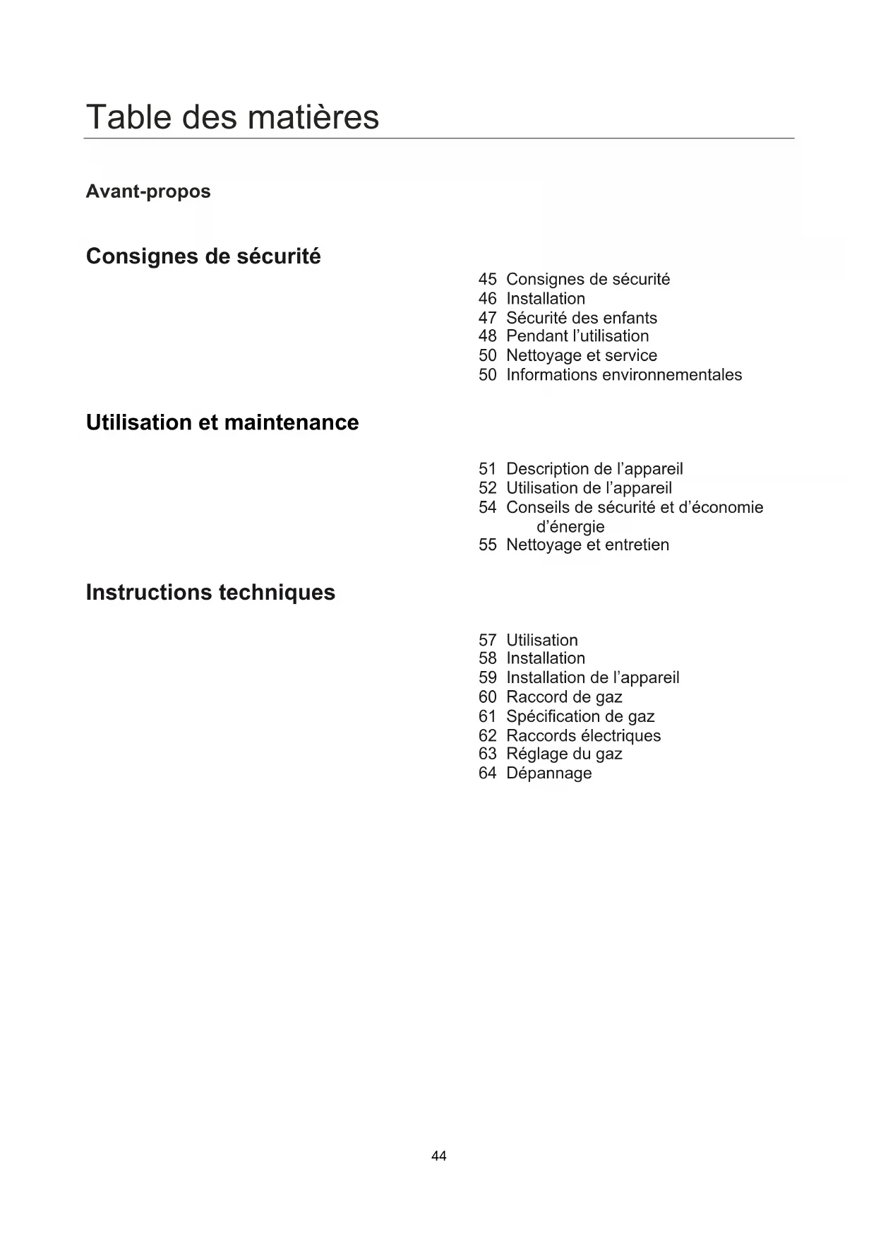 ■ If problem is not solved, please contact customer care centre.44 Table des matières Avant-propos Consignes de sécurité 45 Consignes de sécurité 46 Installation 47 Sécurité des enfants 48 Pendant l’utilisation 50 Nettoyage et service 50 Informations environnementales Utilisation et maintenance 51 Description de l’appareil 52 Utilisation de l’appareil 54 Conseils de sécurité et d’économie d’énergie 55 Nettoyage et entretien Instructions techniques 57 Utilisation 58 Installation 59 Installation de l’appareil 60 Raccord de gaz 61 Spécification de gaz 62 Raccords électriques 63 Réglage du gaz 64 Dépannage45 Consignes de sécurité ■ Veuillez prendre le temps de lire ce manuel d’utilisation avant d’installer ou d’utiliser l’appareil. ■ Ce manuel doit être conservé pour pouvoir être consulté ultérieurement. Si l’appareil est vendu ou transmis à une autre personne, ce manuel doit également être remis au nouvel utilisateur. ■ Le fabricant décline toute responsabilité en cas de non-respect de ces mesures de sécurité. ■ Les remarques suivantes sont conçues pour être faciles à comprendre, afin de prévenir les accidents par une mauvaise utilisation et de rendre l’appareil plus pratique à utiliser. ■ Lisez attentivement les chapitres suivants.