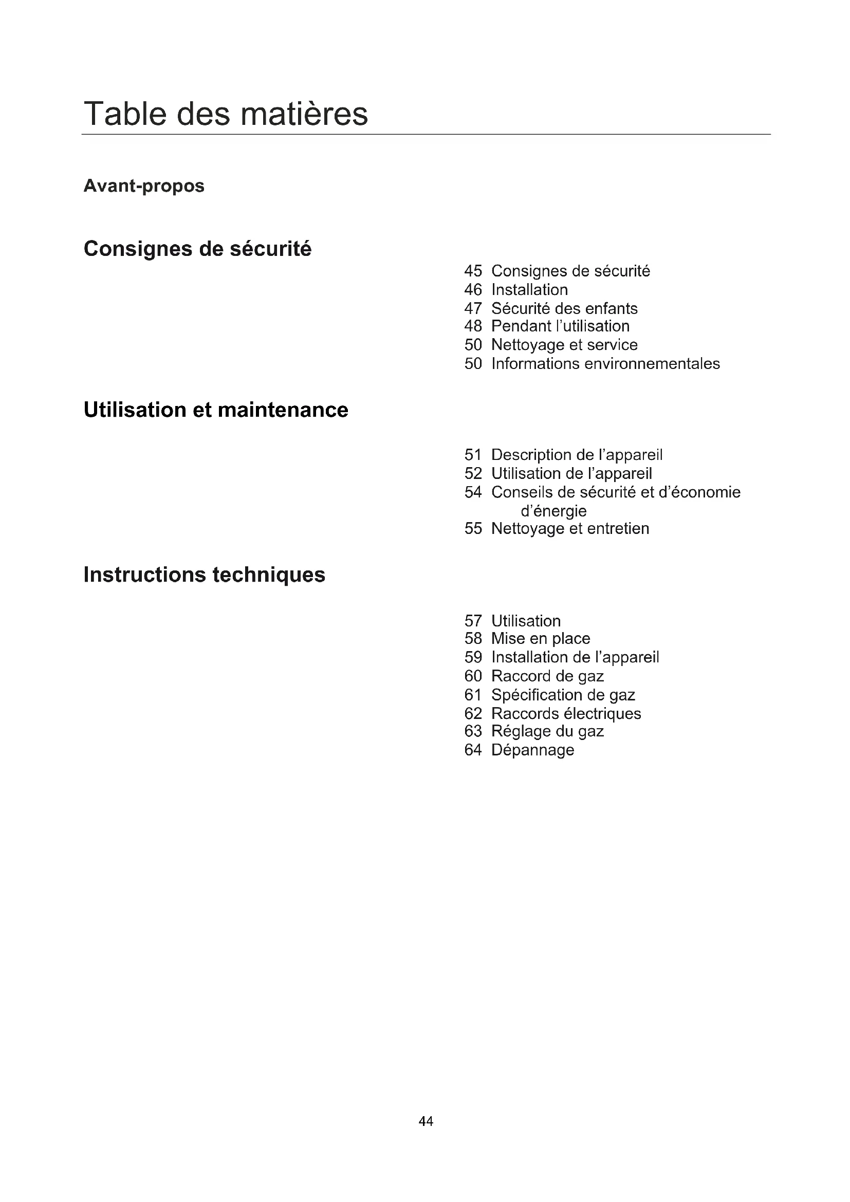 ■ If problem is not solved, please contact customer care centre.44 Table des matières Avant-propos Consignes de sécurité 45 Consignes de sécurité 46 Installation 47 Sécurité des enfants 48 Pendant l’utilisation 50 Nettoyage et service 50 Informations environnementales Utilisation et maintenance 51 Description de l’appareil 52 Utilisation de l’appareil 54 Conseils de sécurité et d’économie d’énergie 55 Nettoyage et entretien Instructions techniques 57 Utilisation 58 Mise en place 59 Installation de l’appareil 60 Raccord de gaz 61 Spécification de gaz 62 Raccords électriques 63 Réglage du gaz 64 Dépannage45 Consignes de sécurité ■ Veuillez prendre le temps de lire ce manuel d’utilisation avant d’installer ou d’utiliser l’appareil. ■ Ce manuel doit être conservé pour pouvoir être consulté ultérieurement. Si l’appareil est vendu ou transmis à une autre personne, ce manuel doit également être remis au nouvel utilisateur. ■ Le fabricant décline toute responsabilité en cas de non-respect de ces mesures de sécurité. ■ Les remarques suivantes sont conçues pour être faciles à comprendre, afin de prévenir les accidents par une mauvaise utilisation et de rendre l’appareil plus pratique à utiliser. ■ Lisez attentivement les chapitres suivants.