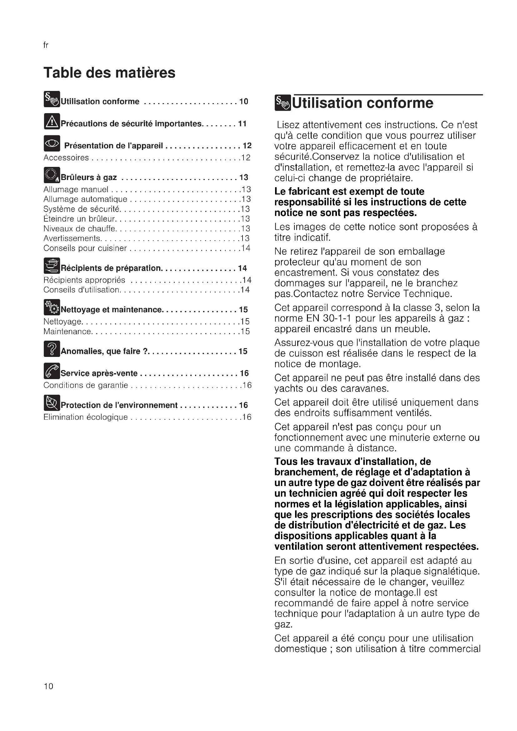 - Présentation de l'appareil . . . . . . . . . . . . . . . . . 12 Accessoires . . . . . . . . . . . . . . . . . . . . . . . . . . . . . . . .12 Ä Brûleurs à gaz . . . . . . . . . . . . . . . . . . . . . . . . . . 13 Allumage manuel . . . . . . . . . . . . . . . . . . . . . . . . . . . .13 Allumage automatique . . . . . . . . . . . . . . . . . . . . . . . .13 Système de sécurité. . . . . . . . . . . . . . . . . . . . . . . . . .13 Éteindre un brûleur. . . . . . . . . . . . . . . . . . . . . . . . . . .13 Niveaux de chauffe. . . . . . . . . . . . . . . . . . . . . . . . . . .13 Avertissements. . . . . . . . . . . . . . . . . . . . . . . . . . . . . .13 Conseils pour cuisiner . . . . . . . . . . . . . . . . . . . . . . . .14 Å Récipients de préparation. . . . . . . . . . . . . . . . . 14 Récipients appropriés . . . . . . . . . . . . . . . . . . . . . . . .14 Conseils d'utilisation. . . . . . . . . . . . . . . . . . . . . . . . . .14 2 Nettoyage et maintenance. . . . . . . . . . . . . . . . . 15 Nettoyage. . . . . . . . . . . . . . . . . . . . . . . . . . . . . . . . . .15 Maintenance. . . . . . . . . . . . . . . . . . . . . . . . . . . . . . . .15 3 Anomalies, que faire ?. . . . . . . . . . . . . . . . . . . . 15 4 Service après-vente . . . . . . . . . . . . . . . . . . . . . . 16 Conditions de garantie . . . . . . . . . . . . . . . . . . . . . . . .16 7 Protection de l'environnement . . . . . . . . . . . . . 16 Elimination écologique . . . . . . . . . . . . . . . . . . . . . . . .16 8Utilisation conforme Utilisation conf or me Lisez attentivement ces instructions. Ce n'est qu'à cette condition que vous pourrez utiliser votre appareil efficacement et en toute sécurité.Conservez la notice d'utilisation et d'installation, et remettez-la avec l'appareil si celui-ci change de propriétaire. Le fabricant est exempt de toute responsabilité si les instructions de cette notice ne sont pas respectées. Les images de cette notice sont proposées à titre indicatif. Ne retirez l'appareil de son emballage protecteur qu'au moment de son encastrement. Si vous constatez des dommages sur l'appareil, ne le branchez pas.Contactez notre Service Technique. Cet appareil correspond à la classe 3, selon la norme EN 30-1-1 pour les appareils à gaz : appareil encastré dans un meuble. Assurez-vous que l'installation de votre plaque de cuisson est réalisée dans le respect de la notice de montage. Cet appareil ne peut pas être installé dans des yachts ou des caravanes. Cet appareil doit être utilisé uniquement dans des endroits suffisamment ventilés. Cet appareil n'est pas conçu pour un fonctionnement avec une minuterie externe ou une commande à distance. Tous les travaux d'installation, de branchement, de réglage et d'adaptation à un autre type de gaz doivent être réalisés par un technicien agréé qui doit respecter les normes et la législation applicables, ainsi que les prescriptions des sociétés locales de distribution d'électricité et de gaz. Les dispositions applicables quant à la ventilation seront attentivement respectées. En sortie d'usine, cet appareil est adapté au type de gaz indiqué sur la plaque signalétique. S'il était nécessaire de le changer, veuillez consulter la notice de montage.Il est recommandé de faire appel à notre service technique pour l'adaptation à un autre type de gaz. Cet appareil a été conçu pour une utilisation domestique ; son utilisation à titre commercialPrécautions de sécurité importantes fr