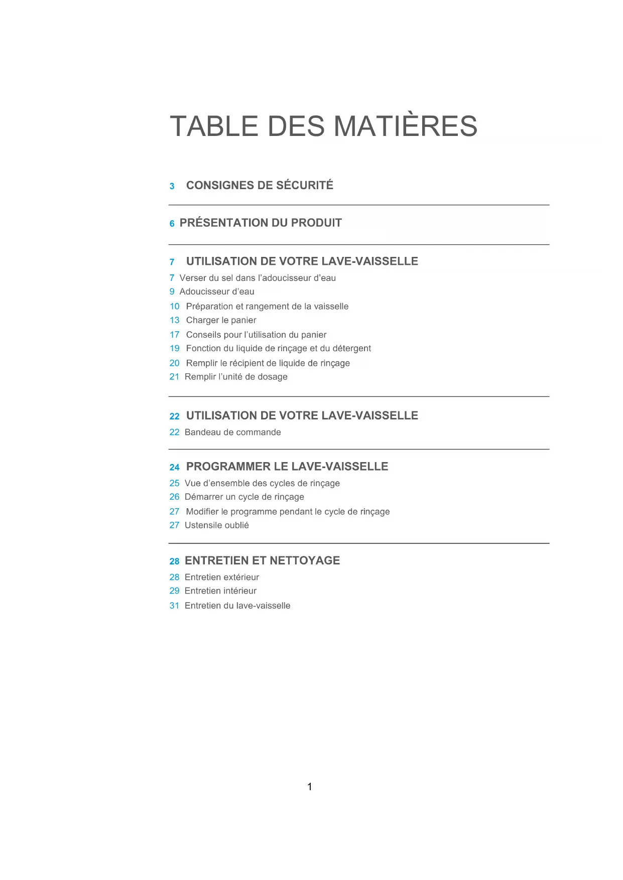 25 Vue d’ensemble des cycles de rinçage 26 Démarrer un cycle de rinçage 27 Modifier le programme pendant le cycle de rinçage 27 Ustensile oublié 28 ENTRETIEN ET NETTOYAGE 28 Entretien extérieur 29 Entretien intérieur 31 Entretien du lave-vaisselle2