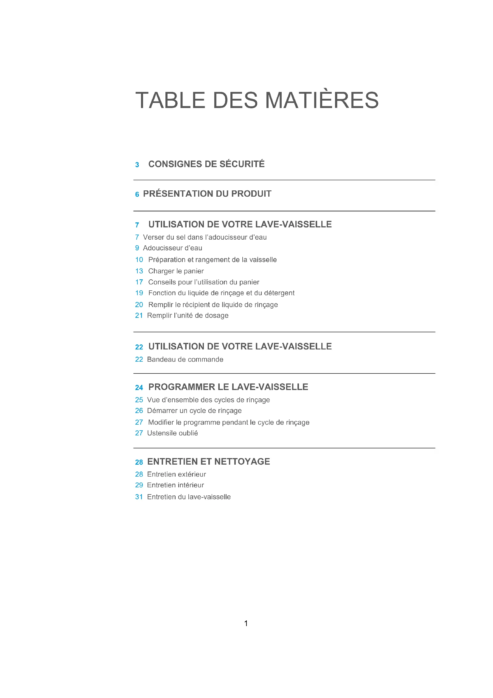 7 Verser du sel dans l'adoucisseur d'eau 9 Adoucisseur d'eau 10 Préparation et rangement de la vaisselle 13 Charger le panier 17 Conseils pour l'utilisation du panier 19 Fonction du liquide de rinçage et du détergent 20 Remplir le récipient de liquide de rinçage 21 Remplir l'unité de dosage