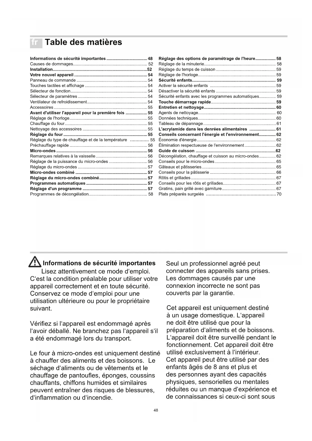 - Preheat the cooking compartment for 5minutes. ** Place the food in suitable, heat-resistant ovenware. Type of heating Temperature °C Microwave power in watts Cooking time in minutes48 Table des matières Informations de sécurité importantes .................................. 48 Causes de dommages.............................................................. 52 Installation ............................................................................... 52 Votre nouvel appareil ............................................................. 54 Panneau de commande ........................................................... 54 Touches tactiles et afchage .................................................... 54 Sélecteur de fonction ................................................................ 54 Sélecteur de paramètres .......................................................... 54 Ventilateur de refroidissement .................................................. 54 Accessoires .............................................................................. 55 Avant d'utiliser l'appareil pour la première fois .................. 55 Réglage de l'horloge ................................................................. 55 Chauffage du four ..................................................................... 55 Nettoyage des accessoires ...................................................... 55 Réglage du four ...................................................................... 55 Réglage du type de chauffage et de la température 55 Préchauffage rapide ................................................................. 56 Micro-ondes ............................................................................ 56 Remarques relatives à la vaisselle ........................................... 56 Réglage de la puissance du micro-ondes ................................ 56 Réglage du micro-ondes .......................................................... 57 Micro-ondes combiné ............................................................ 57 Réglage du micro-ondes combiné ........................................ 57 Programmes automatiques ................................................... 57 Réglage d'un programme ...................................................... 57 Programmes de décongélation................................................. 58 Réglage des options de paramétrage de l'heure ................. 58 Réglage de la minuterie............................................................ 58 Réglage du temps de cuisson .................................................. 59 Réglage de l'horloge ................................................................. 59 Sécurité enfants...................................................................... 59 Activer la sécurité enfants ....................................................... 59 Désactiver la sécurité enfants .................................................. 59 Sécurité enfants avec les programmes automatiques.............. 59 Touche démarrage rapide ...................................................... 59 Entretien et nettoyage ............................................................ 60 Agents de nettoyage................................................................. 60 Données techniques ................................................................. 60 Tableau de dépannage ............................................................. 61 L'acrylamide dans les denrées alimentaires ...................... 61 Conseils concernant l'énergie et l'environnement .............. 62 Économie d'énergie .................................................................. 62 Élimination respectueuse de l'environnement .......................... 62 Guide de cuisson ................................................................... 62 Décongélation, chauffage et cuisson au micro-ondes .............. 62 Conseils pour le micro-ondes ................................................... 65 Gâteaux et pâtisseries .............................................................. 65 Conseils pour la pâtisserie ....................................................... 66 Rôtis et grillades ....................................................................... 67 Conseils pour les rôtis et grillades ............................................ 67 Gratins, pain grillé avec garniture ............................................. 67 Plats préparés surgelés 70 Informations de sécurité importantes Lisez attentivement ce mode d‘emploi. C‘est la condition préalable pour utiliser votre appareil correctement et en toute sécurité. Conservez ce mode d‘emploi pour une utilisation ultérieure ou pour le propriétaire suivant. Vériez si l‘appareil est endommagé après l‘avoir déballé. Ne branchez pas l‘appareil s‘il a été endommagé lors du transport. Le four à micro-ondes est uniquement destiné à chauffer des aliments et des boissons. Le séchage d‘aliments ou de vêtements et le chauffage de pantoues, éponges, coussins chauffants, chiffons humides et similaires peuvent entraîner des risques de blessures, d‘inammation ou d‘incendie. Seul un professionnel agréé peut connecter des appareils sans prises. Les dommages causés par une connexion incorrecte ne sont pas couverts par la garantie. Cet appareil est uniquement destiné à un usage domestique. L‘appareil ne doit être utilisé que pour la préparation d‘aliments et de boissons. L‘appareil doit être surveillé pendant le fonctionnement. Cet appareil doit être utilisé exclusivement à l‘intérieur. Cet appareil peut être utilisé par des enfants âgés de 8 ans et plus et des personnes ayant des capacités physiques, sensorielles ou mentales réduites ou un manque d‘expérience et de connaissances si ceux-ci sont sous fr49 surveillance ou ont reçu des instructions concernant l‘utilisation de l‘appareil de manière