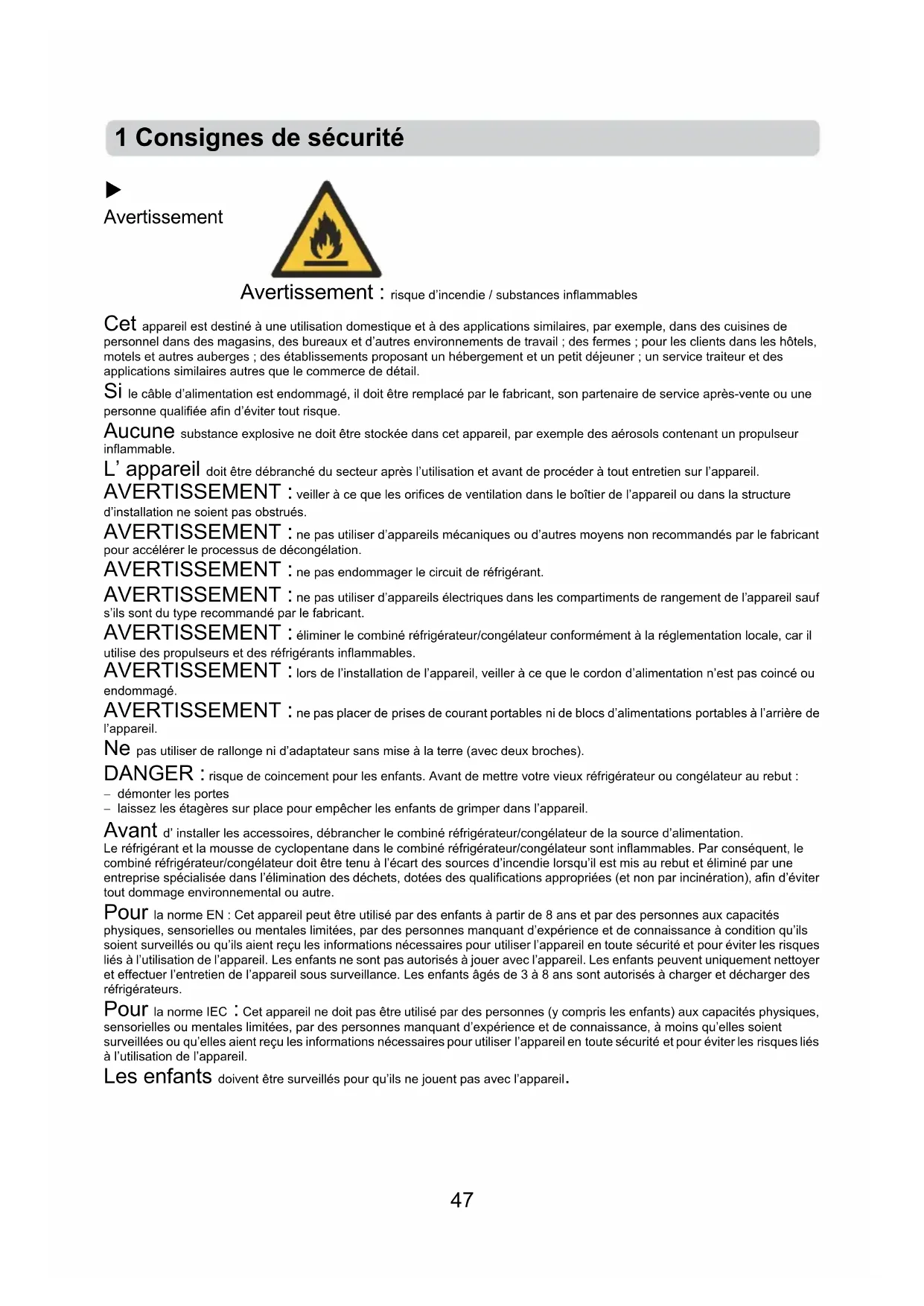 - démonter les portes - laissez les étagères sur place pour empêcher les enfants de grimper dans l’appareil. Avant d’ installer les accessoires, débrancher le combiné réfrigérateur/congélateur de la source d’alimentation. Le réfrigérant et la mousse de cyclopentane dans le combiné réfrigérateur/congélateur sont inflammables. Par conséquent, le combiné réfrigérateur/congélateur doit être tenu à l’écart des sources d’incendie lorsqu’il est mis au rebut et éliminé par une entreprise spécialisée dans l’élimination des déchets, dotées des qualifications appropriées (et non par incinération), afin d’éviter tout dommage environnemental ou autre. Pour la norme EN : Cet appareil peut être utilisé par des enfants à partir de 8 ans et par des personnes aux capacités physiques, sensorielles ou mentales limitées, par des personnes manquant d’expérience et de connaissance à condition qu’ils soient surveillés ou qu’ils aient reçu les informations nécessaires pour utiliser l’appareil en toute sécurité et pour éviter les risques liés à l’utilisation de l’appareil. Les enfants ne sont pas autorisés à jouer avec l’appareil. Les enfants peuvent uniquement nettoyer et effectuer l’entretien de l’appareil sous surveillance. Les enfants âgés de 3 à 8 ans sont autorisés à charger et décharger des réfrigérateurs. Pour la norme IEC : Cet appareil ne doit pas être utilisé par des personnes (y compris les enfants) aux capacités physiques, sensorielles ou mentales limitées, par des personnes manquant d’expérience et de connaissance, à moins qu’elles soient surveillées ou qu’elles aient reçu les informations nécessaires pour utiliser l’appareil en toute sécurité et pour éviter les risques liés à l’utilisation de l’appareil. Les enfants doivent être surveillés pour qu’ils ne jouent pas avec l’appareil. 1 Consignes de sécurité48 Les instructions doivent contenir les éléments suivants : pour éviter la contamination des aliments, veuillez suivre les instructions suivantes : - Une ouverture prolongée de la porte peut entraîner une augmentation significative de la température dans les compartiments de l’appareil. - Nettoyez régulièrement les surfaces pouvant entrer en contact avec des aliments et les systèmes de drainage accessibles. - Nettoyez les réservoirs d’eau s’ils n’ont pas été utilisés pendant 48 heures. Rincez les systèmes d’eau raccordés à une source d’eau lorsqu’aucune eau n’est prélevée pendant 5 jours. (Remarque 1) - Conservez la viande et le poisson crus dans des récipients adaptés dans le combiné réfrigérateur/congélateur, de manière à ce qu’ils n’entrent pas en contact avec d’autres aliments ni ne s’égouttent dessus. - Les compartiments congélateur à deux étoiles conviennent au stockage de produits surgelés, au stockage ou à la production de crème glacée et à la production de glaçons. (Remarque 2) - Les compartiments à une , deux et trois étoiles ne conviennent pas à la congélation d’aliments frais. (Remarque 3) - Si le réfrigérateur reste vide pendant une période prolongée, éteignez-le, décongelez-le, nettoyez-le, séchez-le et laissez la porte ouverte pour éviter la formation de moisissure à l’intérieur de l’appareil. Remarques 1, 2, 3 : veuillez vérifier si cela s’applique au type de compartiment de votre produit.49