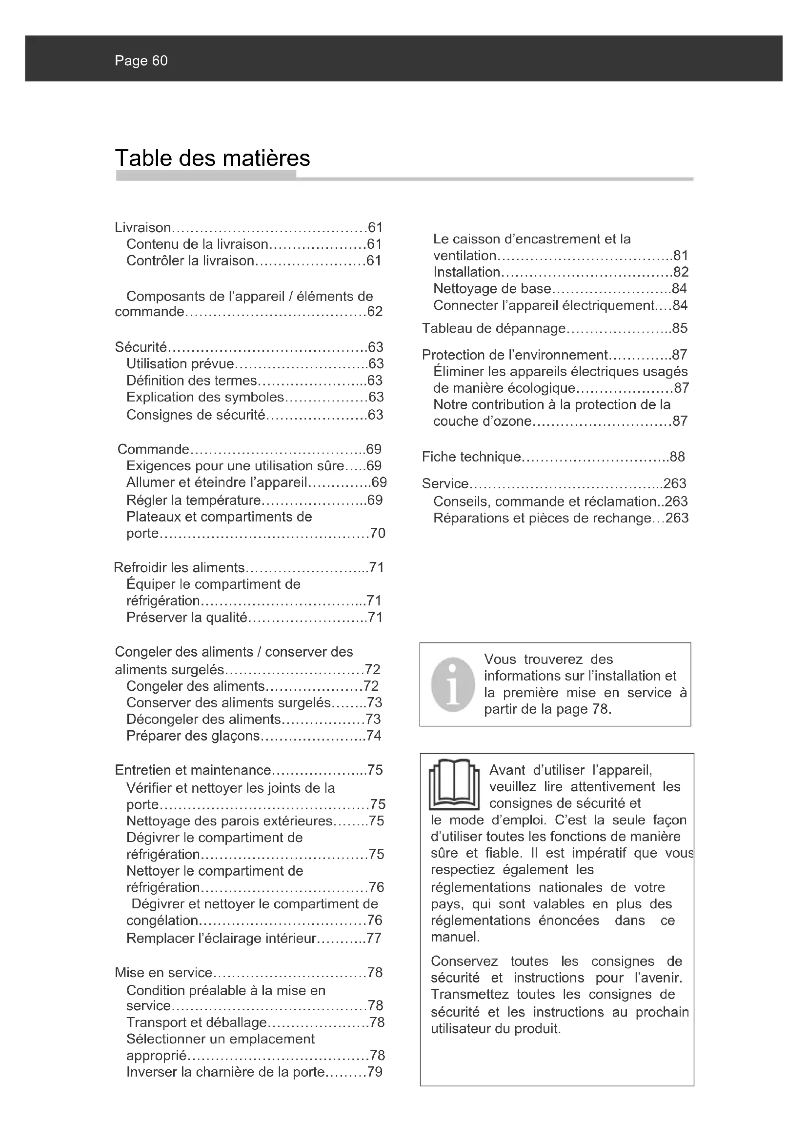 - requently. This means that an undesirable temperature increase may result. If the appliance is located in a warm room, it must switch on more frequently to maintain the low temperatures inside the appliance. For this reason, please ensure compliance with the ambient temperature. Ambient temperature per climate class SN: +10 °C to +32 °C N: +16 °C to +32 °C ST: +16 °C to +38 °C T: +16 °C to +43 °C The data provided here refers to the ambient conditions exactly specified in the test standard. For this reason, the values in your household may differ from the data provided here. N/A N/A 18 gPage 60 Table des matières Livraison……………………………………61 Contenu de la livraison…………………61 Contrôler la livraison……………………61 Composants de l’appareil / éléments de commande…………………………………62 Sécurité…………………………………….63 Utilisation prévue……………………… p. 63