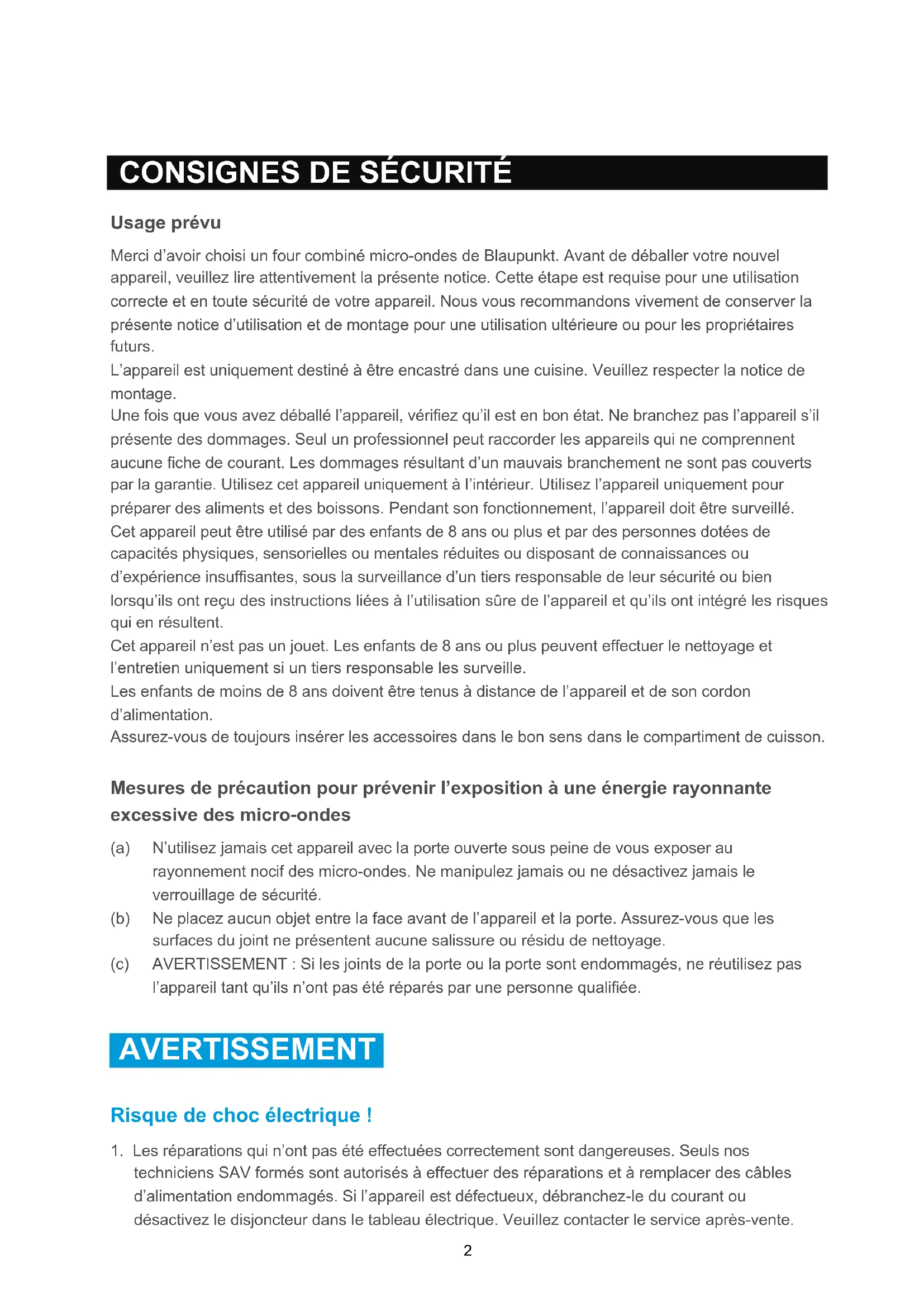 Usage prévu Merci d’avoir choisi un four combiné micro-ondes de Blaupunkt. Avant de déballer votre nouvel appareil, veuillez lire attentivement la présente notice. Cette étape est requise pour une utilisation correcte et en toute sécurité de votre appareil. Nous vous recommandons vivement de conserver la présente notice d’utilisation et de montage pour une utilisation ultérieure ou pour les propriétaires futurs. L’appareil est uniquement destiné à être encastré dans une cuisine. Veuillez respecter la notice de montage. Une fois que vous avez déballé l’appareil, vérifiez qu’il est en bon état. Ne branchez pas l’appareil s’il présente des dommages. Seul un professionnel peut raccorder les appareils qui ne comprennent aucune fiche de courant. Les dommages résultant d’un mauvais branchement ne sont pas couverts par la garantie. Utilisez cet appareil uniquement à l’intérieur. Utilisez l’appareil uniquement pour préparer des aliments et des boissons. Pendant son fonctionnement, l’appareil doit être surveillé. Cet appareil peut être utilisé par des enfants de 8 ans ou plus et par des personnes dotées de capacités physiques, sensorielles ou mentales réduites ou disposant de connaissances ou d’expérience insuffisantes, sous la surveillance d’un tiers responsable de leur sécurité ou bien lorsqu’ils ont reçu des instructions liées à l’utilisation sûre de l’appareil et qu’ils ont intégré les risques qui en résultent. Cet appareil n’est pas un jouet. Les enfants de 8 ans ou plus peuvent effectuer le nettoyage et l’entretien uniquement si un tiers responsable les surveille. Les enfants de moins de 8 ans doivent être tenus à distance de l’appareil et de son cordon d’alimentation. Assurez-vous de toujours insérer les accessoires dans le bon sens dans le compartiment de cuisson. Mesures de précaution pour prévenir l’exposition à une énergie rayonnante excessive des micro-ondes (a) N’utilisez jamais cet appareil avec la porte ouverte sous peine de vous exposer au rayonnement nocif des micro-ondes. Ne manipulez jamais ou ne désactivez jamais le verrouillage de sécurité. (b) Ne placez aucun objet entre la face avant de l’appareil et la porte. Assurez-vous que les surfaces du joint ne présentent aucune salissure ou résidu de nettoyage. (c) AVERTISSEMENT : Si les joints de la porte ou la porte sont endommagés, ne réutilisez pas l’appareil tant qu’ils n’ont pas été réparés par une personne qualifiée. AVERTISSEMENT Risque de choc électrique ! 1. Les réparations qui n’ont pas été effectuées correctement sont dangereuses. Seuls nos techniciens SAV formés sont autorisés à effectuer des réparations et à remplacer des câbles d’alimentation endommagés. Si l’appareil est défectueux, débranchez-le du courant ou désactivez le disjoncteur dans le tableau électrique. Veuillez contacter le service après-vente.3