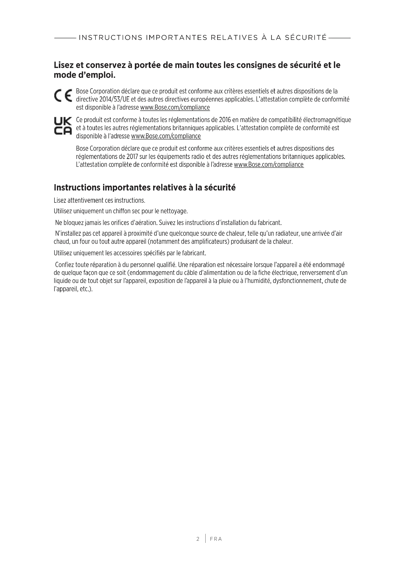 FRA Lisez et conservez à portée de main toutes les consignes de sécurité et le mode d’emploi. Bose Corporation déclare que ce produit est conforme aux critères essentiels et autres dispositions de la directive 2014/53/UE et des autres directives européennes applicables. L’attestation complète de conformité est disponible à l’adresse www.Bose.com/compliancewww.Bose.com/compliance Ce produit est conforme à toutes les réglementations de 2016 en matière de compatibilité électromagnétique et à toutes les autres réglementations britanniques applicables. L’attestation complète de conformité est disponible à l’adresse www.Bose.com/compliancewww.Bose.com/compliance Bose Corporation déclare que ce produit est conforme aux critères essentiels et autres dispositions des réglementations de 2017 sur les équipements radio et des autres réglementations britanniques applicables. L’attestation complète de conformité est disponible à l’adresse www.Bose.com/compliancewww.Bose.com/compliance Instructions importantes relatives à la sécurité Lisez attentivement ces instructions. Utilisez uniquement un chiffon sec pour le nettoyage. Ne bloquez jamais les orifices d’aération. Suivez les instructions d’installation du fabricant. N’installez pas cet appareil à proximité d’une quelconque source de chaleur, telle qu’un radiateur, une arrivée d’air chaud, un four ou tout autre appareil (notamment des amplificateurs) produisant de la chaleur. Utilisez uniquement les accessoires spécifiés par le fabricant. Confiez toute réparation à du personnel qualifié. Une réparation est nécessaire lorsque l’appareil a été endommagé de quelque façon que ce soit (endommagement du câble d’alimentation ou de la fiche électrique, renversement d’un liquide ou de tout objet sur l’appareil, exposition de l’appareil à la pluie ou à l’humidité, dysfonctionnement, chute de l’appareil, etc.).INSTRUCTIONS IMPORTANTES RELATIVES À LA SÉCURITÉ