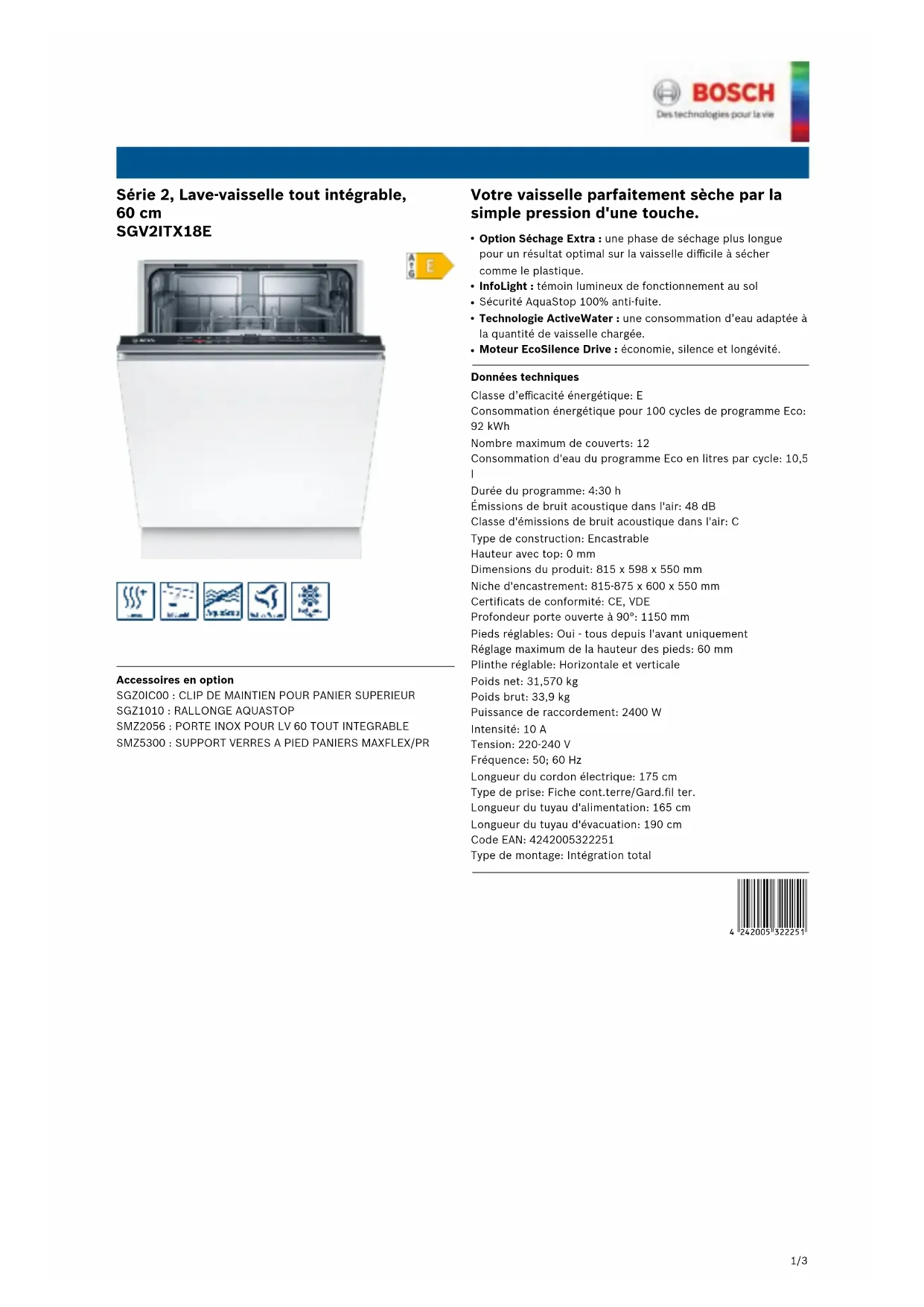 Durée du programme: 4:30 h Émissions de bruit acoustique dans l'air: 48 dB Classe d'émissions de bruit acoustique dans l'air: C Type de construction: Encastrable Hauteur avec top: 0 mm Dimensions du produit: 815 x 598 x 550 mm Niche d'encastrement: 815-875 x 600 x 550 mm Certificats de conformité: CE, VDE Profondeur porte ouverte à 90°: 1150 mm Pieds réglables: Oui - tous depuis l'avant uniquement Réglage maximum de la hauteur des pieds: 60 mm Plinthe réglable: Horizontale et verticale Poids net: 31,570 kg Poids brut: 33,9 kg Puissance de raccordement: 2400 W Intensité: 10 A Tension: 220-240 V Fréquence: 50; 60 Hz Longueur du cordon électrique: 175 cm Type de prise: Fiche cont.terre/Gard.fil ter. Longueur du tuyau d'alimentation: 165 cm Longueur du tuyau d'évacuation: 190 cm Code EAN: 4242005322251 Type de montage: Intégration total '!2E20AF-dcccfb! 1/3Série 2, Lave-vaisselle tout intégrable, 60 cm