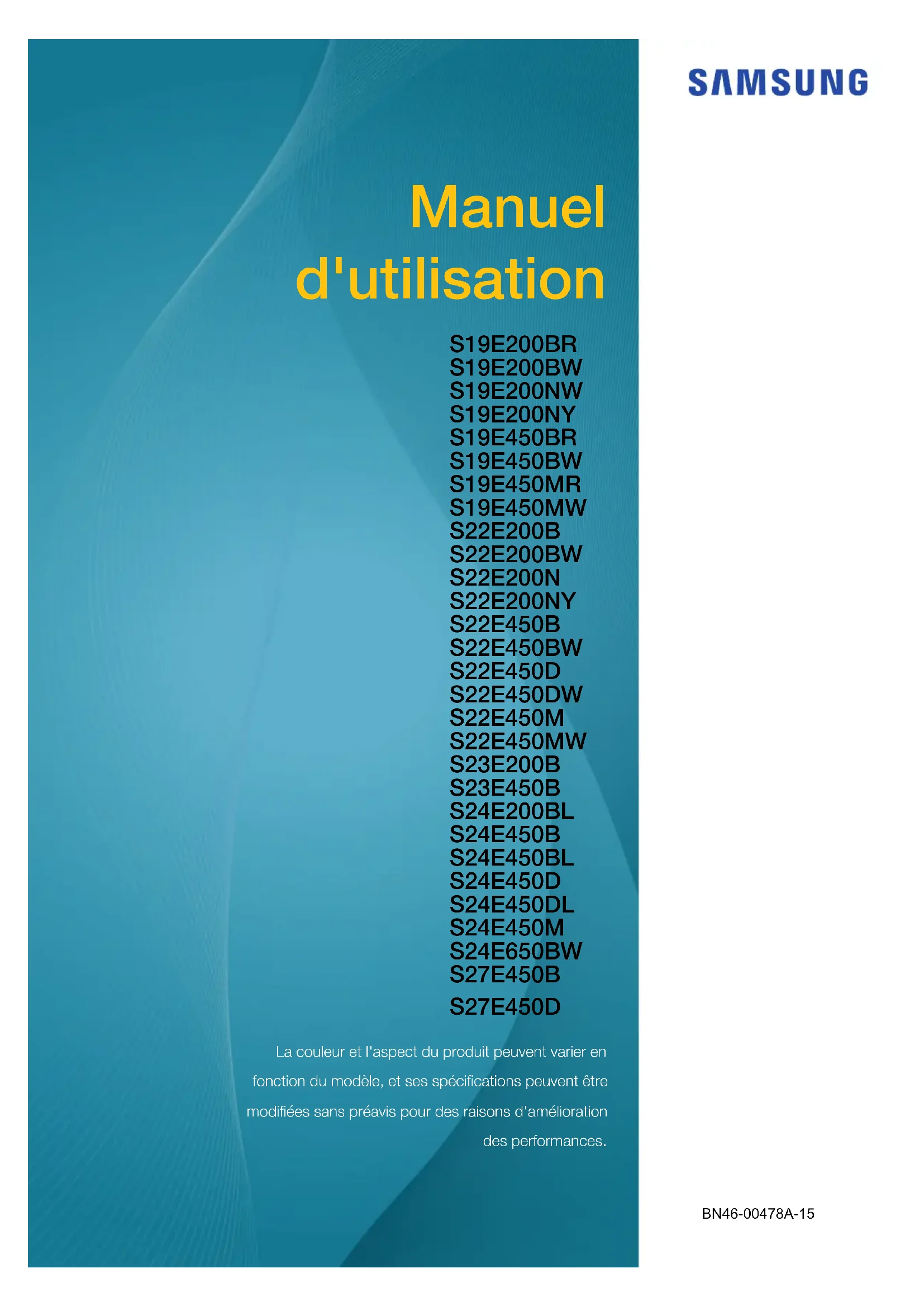 Manuel d'utilisation S19E200BR S19E200BW S19E200NW S19E200NY S19E450BR S19E450BW S19E450MR S19E450MW S22E200B S22E200BW S22E200N S22E200NY S22E450B S22E450BW S22E450D S22E450DW S22E450M S22E450MW S23E200B S23E450B S24E200BL S24E450B S24E450BL S24E450D S24E450DL S24E450M S24E650BW S27E450B S27E450D La couleur et l'aspect du produit peuvent varier en fonction du modèle, et ses spécifications peuvent être modifiées sans préavis pour des raisons d'amélioration des performances. BN46-00478A-15Table des matières