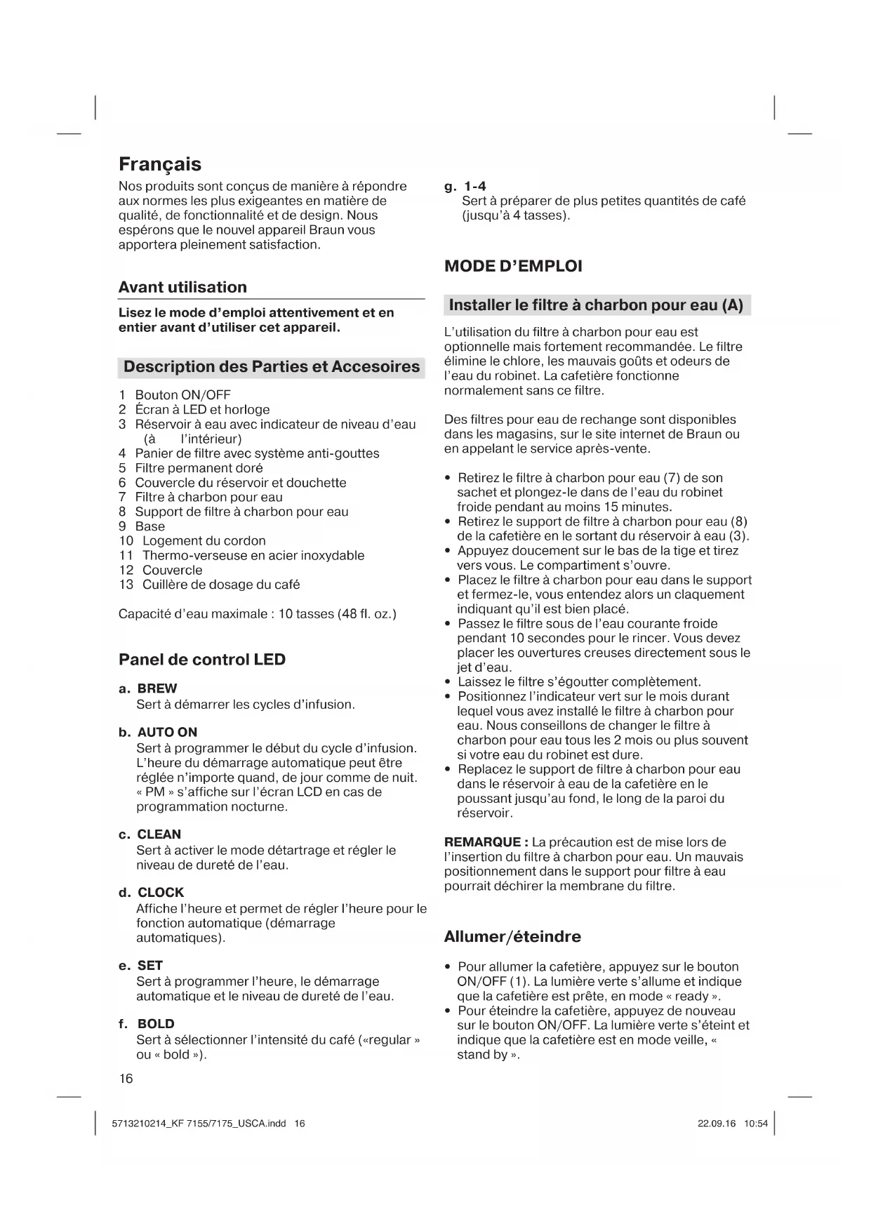 INSTRUCTIONS RELATIVES AU CORDON D’ALIMENTATION SPÉCIAL Un cordon d’alimentation court est fourni avec l’appareil pour réduire les risques d’enchevêtre- ment ou de trébuchement que présente un cordon d’alimentation plus long. Des cordons d’alimentation détachables plus longs ou des rallonges ne sont pas recommandés mais peuvent être utilisés avec prudence. Si un cordon d’alimentation plus long est utilisé : (1) le calibre électrique indiqué sur le cordon plus long ou la rallonge doit être au moins aussi élevé que le calibre électrique de l’appareil, (2) le cordon doit être disposé de sorte qu’il ne pende pas du comptoir ou de la table, où des enfants peuvent le tirer ou trébucher dessus par inadvertance. 5713210214_KF 7155/7175_USCA.indd 55713210214_KF 7155/7175_USCA.indd 5 22.09.16 10:5422.09.16 10:54CUIDADOS IMPORTANTES Al usar aparatos eléctricos, siempre se deben seguir las precauciones de seguridad básicas para reducir el riesgo de incendio, descarga eléctrica o lesiones a las personas, incluyendo las siguientes: LEA TODAS LAS INSTRUCCIONES.