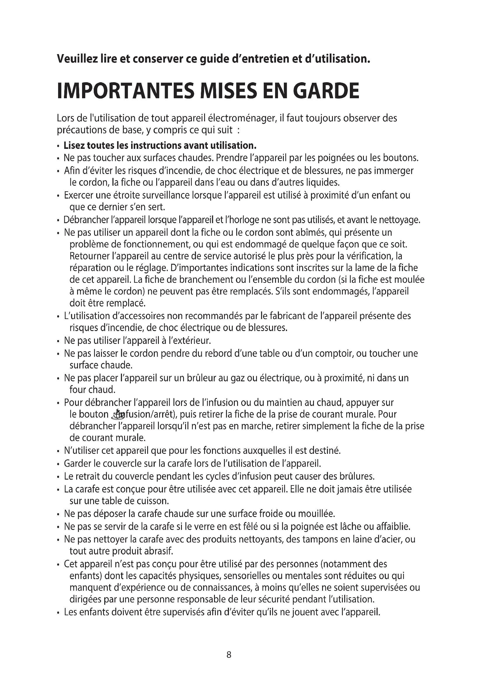 - Les enfants doivent être supervisés afin d’éviter qu’ils ne jouent avec l’appareil.9 CONSERVER CES MESURES. Cet appareil est conçu pour un usage domestique seulement.