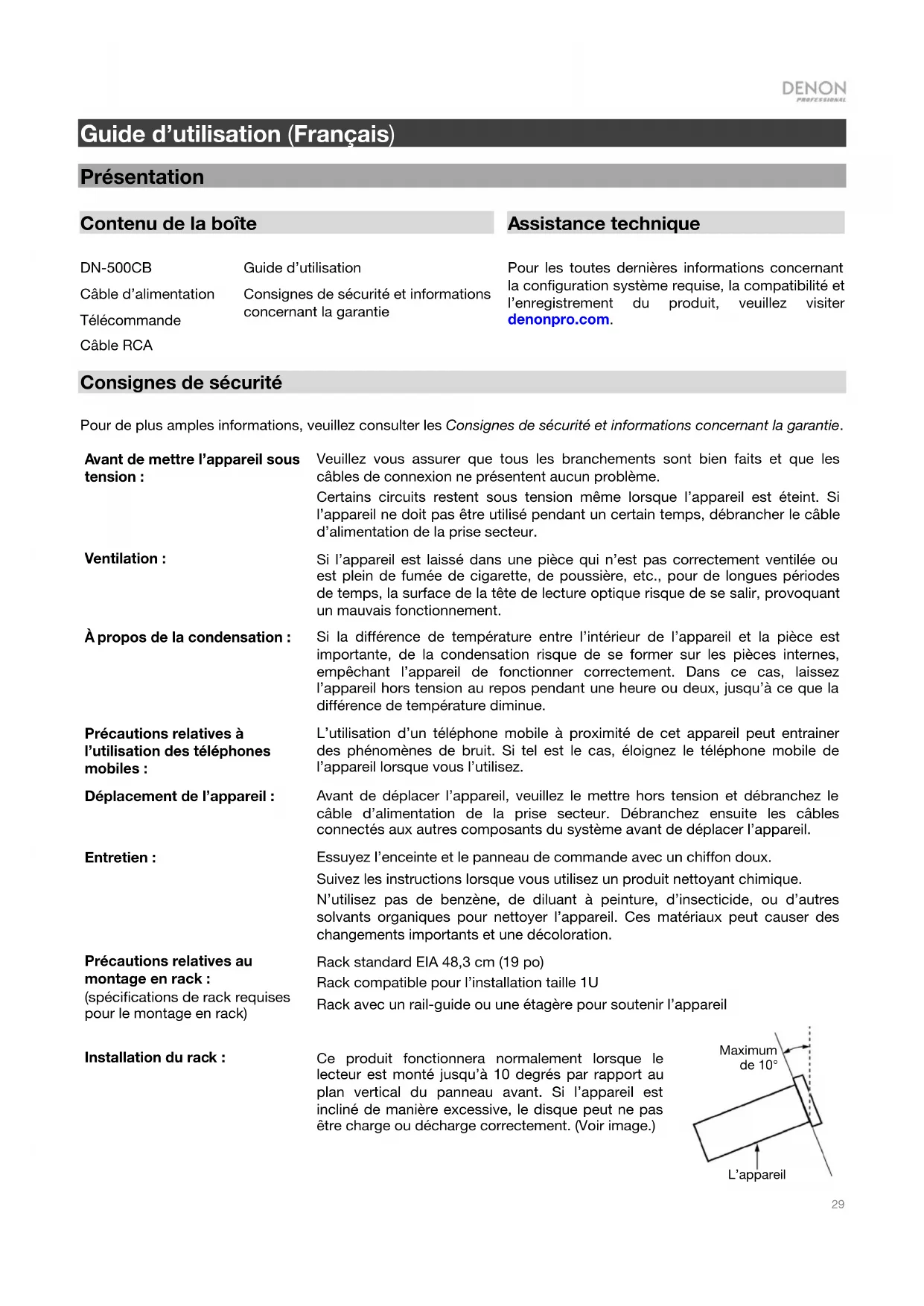ssistance technique DN-500CB Câble d’alimentation Télécommande Guide d’utilisation Consignes de sécurité et informations concernant la garantie Pour les toutes dernières informations concernant la configuration système requise, la compatibilité et l’enregistrement du produit, veuillez visiter denonpro.com. Câble RCA Consignes de sécurité Pour de plus amples informations, veuillez consulter les Consignes de sécurité et informations concernant la garantie.