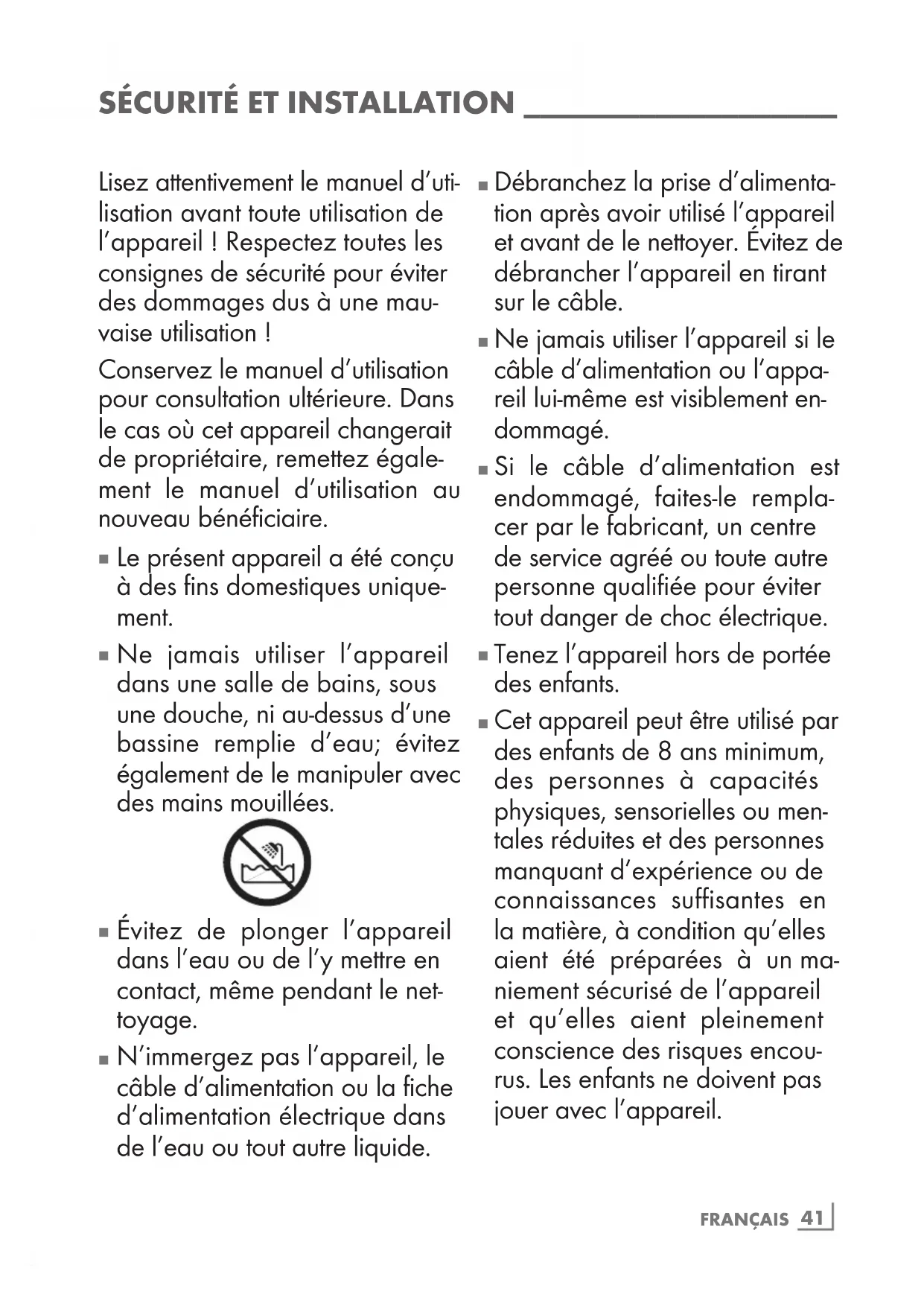 Ne jamais utiliser l’appareil dans une salle de bains, sous une douche, ni au-dessus d’une bassine remplie d’eau; évitez également de le manipuler avec des mains mouillées.