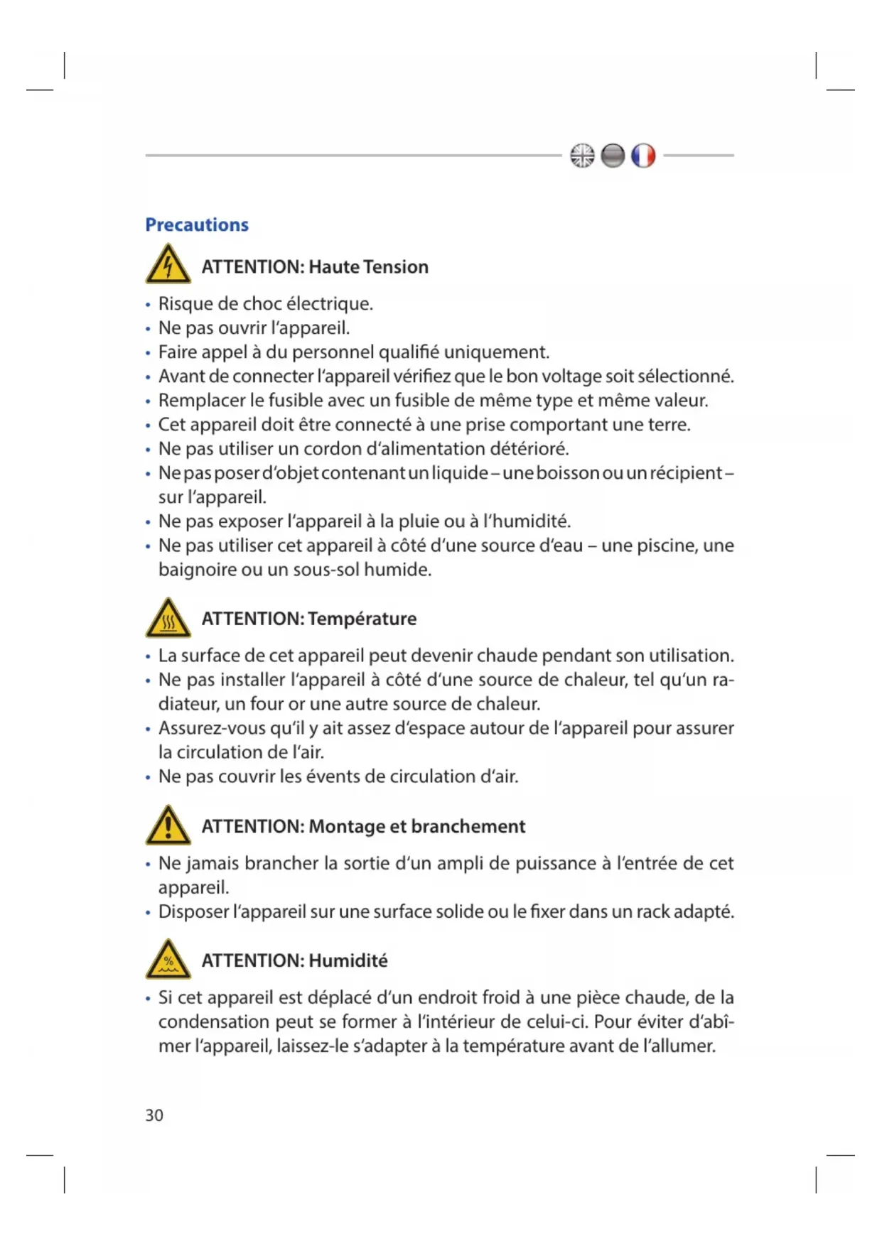 - Ne jamais brancher la sortie d‘un ampli de puissance à l‘entrée de cet appareil.