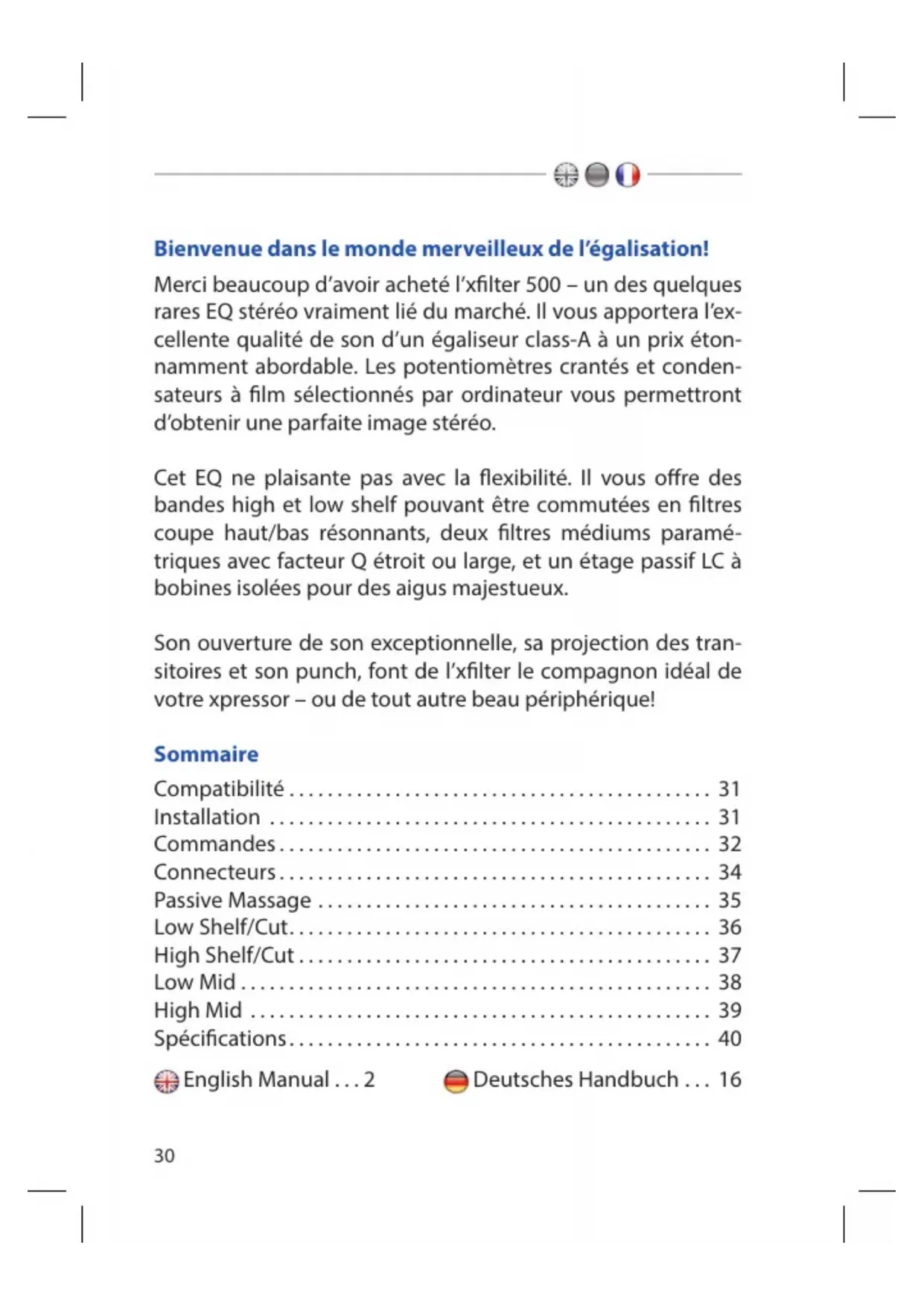 allumez votre boîtier. C’est fait! Maintenant amusez-vous bien avec votre xlter 500!32 Commandes Gain (Low Shelf) Augmente ou atténue les graves » p. 36 Frequency (Low Shelf) Règle la fréquence du ltre low shelf » p. 36 Gain (Low Mid) Augmente ou atténue la bande des bas-médiums » p. 38 Frequency (Low Mid) Règle la fréq. du ltre paramétrique des bas-médiums » p. 38 Gain (High Mid) Augmente ou atténue la bande des haut-médiums » p. 3933 Frequency (High Mid) Règle la fréq. du ltre paramétrique des haut-médiums » p. 39 Gain (High Shelf) Augmente ou atténue la bande des aigus » p. 37 Frequency (High Shelf) Règle la fréquence du ltre high shelf » p. 37 Passive Massage Active le ltre LC passif spécial (LED allumée) ou désactive cette bande additionnelle xe (LED éteinte) » p. 35 Low Cut Commute le ltre low shelf (LED éteinte) en ltre coupe-bas avec résonance (LED allumée) » p. 36 Narrow Q (High Mid) Change le facteur Q de la bande des haut-médiums d’une courbe large (LED éteinte) à étroite (LED allumée) » p. 39 Narrow Q (Low Mid) Change le facteur Q de la bande des bas-médiums d’une courbe large (LED éteinte) à étroite (LED allumée) » p. 38 High Cut Commute le ltre high shelf (LED éteinte) en ltre coupe-haut avec résonance (LED allumée) » p. 37 Hit It! Active l’xlter 500 (LED allumée) ou le désactive par une vraie mise hors-service (hardwire bypass) (LED éteinte)34 Connecteurs Sorties audio (+4 dBu) Aectation en symétrique: 1 terre 2 chaud (+) 3 terre Aectation en asymétrique: 1 terre 2 chaud (+) 3 ottant Audio inputs (+4 dBu) Aectation en symétrique: 1 terre 2 chaud (+) 3 froid (-) Aectation en asymétrique: 1 terre 2 chaud (+) 3 terre Utilisation mono: Connectez l’une ou l’autre des entrées/sor- ties 1 ou 2, les deux marcheront pareil. Utilisation stéréo: Connectez l’une et l’autre des entrées/sor- ties 1 ou 2 – décidez vous même lequel sera canal gauche et l’autre droit.35 Passive Massage Mmm ... L’incroyable touche de magie qu’un EQ passif peut ajouter. Nous l’aimons tous, et en voulons tous! Eh bien voici la bonne nouvelle: En plus de ses quatre bandes actives très exibles, l’xlter 500 dispose d’un ltre LC xe commutable pour le polissage des hautes fréquences. Le ltre se compose principalement d’un condensateur et d’une bo- bine par canal, mais contrairement aux conceptions shelving standards, il a un pic de résonance léger à 12 kHz qui com- mence à retomber à 17 kHz. Ainsi, l’eet de stockage de la bobine, qui se traduit par un genre de saturation très subtile, se concentre sur la zone au- tour du pic sans pour autant trop pousser le haut du spectre dans sa globalité.36 Low Shelf Low Cut37 High Shelf High Cut38 Low Mid (Wide Q) Low Mid (Narrow Q)39 High Mid (Wide Q) High Mid (Narrow Q)40 Données techniques Bande passante: <10 Hz - 400 kHz (-3,0 dB) THD+N @ 0 dBu, 20 Hz - 22 kHz: 0,0018 % THD+N @ +10 dBu, 20 Hz - 22 kHz: 0,005 % Niveau de bruit, 20 Hz - 20 kHz (A-weighted): -98 dBu Plage dynamique, 20 Hz - 22 kHz: 120 dB Niveau d’entrée max: +21 dBu Niveau de sortie max: +21 dBu Impédance d’entrée: 10 kOhm Impédance de sortie: 68 Ohm Conformité CE La conformité de cet appareil aux directives euro- péennes est conrmée par le marquage CE apposé sur l’appareil. Cette déclaration n’est plus valide en cas de modication non- autorisée de l’appareil. Nettetal, 01.05.2013 - Ruben Tilgner41 Précautions ATTENTION: Haute Tension