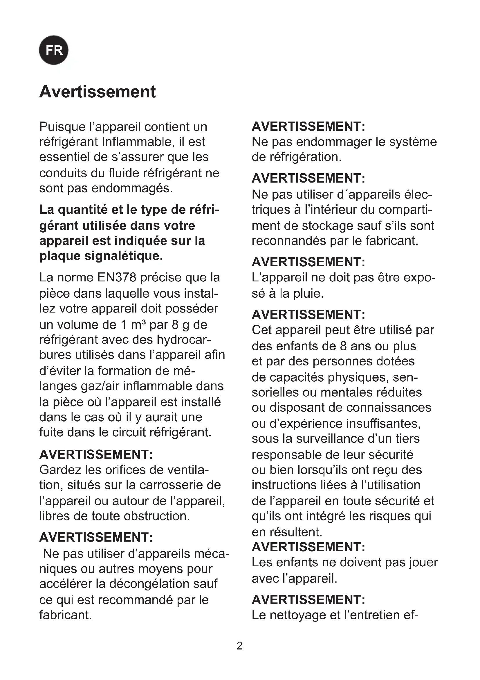 Le nettoyage et l’entretien ef- Puisque l’appareil contient un réfrigérant Inammable, il est essentiel de s’assurer que les conduits du uide réfrigérant ne sont pas endommagés. La quantité et le type de réfri- gérant utilisée dans votre appareil est indiquée sur la plaque signalétique. La norme EN378 précise que la pièce dans laquelle vous instal- lez votre appareil doit posséder un volume de 1 m³ par 8 g de réfrigérant avec des hydrocar- bures utilisés dans l’appareil an d’éviter la formation de mé- langes gaz/air inammable dans la pièce où l’appareil est installé dans le cas où il y aurait une fuite dans le circuit réfrigérant.