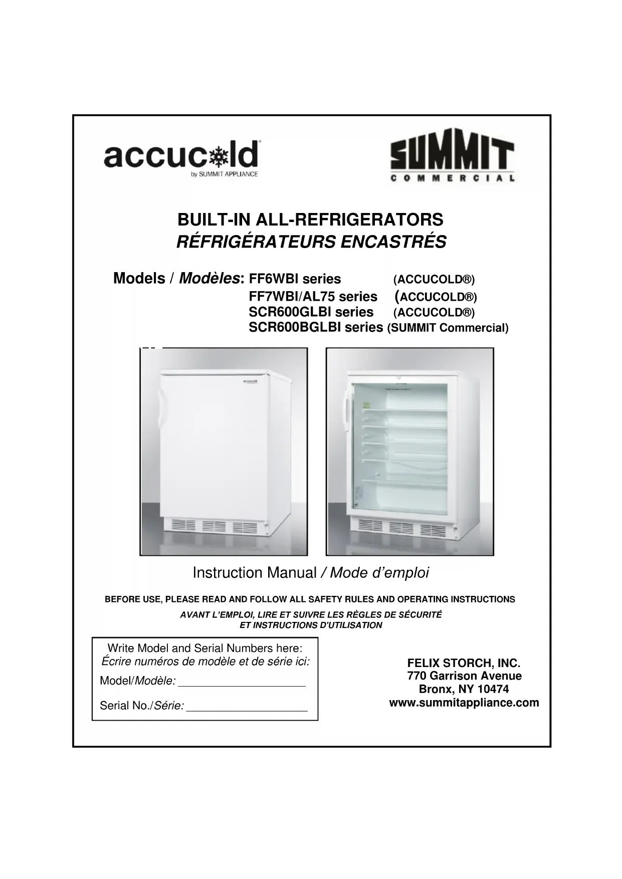 FELIX STORCH, INC. 770 Garrison Avenue Bronx, NY 10474 Téléphone: (718) 893-3900 Télécopieur: (844) 478-8799 www.summitappliance.com Pour les pièces et la commande des accessoires, le dépannage et des conseils de service, visitez le site : www.summitappliance.com/support