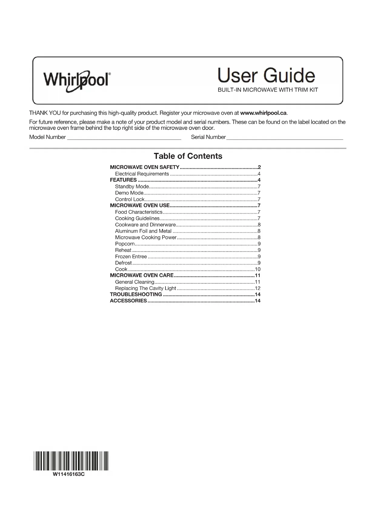Stainless Steel Cleaning Spray Replacement Parts ■ Replacement Cavity Light (Order Part No: W10709921) ■ Turntable glass tray (Order Part No: W11443145) ■ Turntable hub (Order Part No: W11452278) ■ Turntable support (Order Part No: W11443144) ■ Standard Frame without cut-out (Order Part No: W11451304) ■ Standard Frame with cut-out (Order Part No: W11451313) ■ Slim Frame without cut-out (Order Part No: W11451308) ■ Slim Frame with cut-out (Order Part No: W11451314)15 Nous vous REMERCIONS d’avoir acheté ce produit de grande qualité. Enregistrez votre four à micro-ondes au www.whirlpool.ca. Pour référence future, veuillez prendre en note les numéros de modèle et de série de votre produit. Consultez la plaque signalétique du micro-ondes située sur le châssis du four, derrière le côté droit supérieur de la porte du micro-ondes. Numéro de modèle ______________________________________ Numéro de série _________________________________________ Table des matières