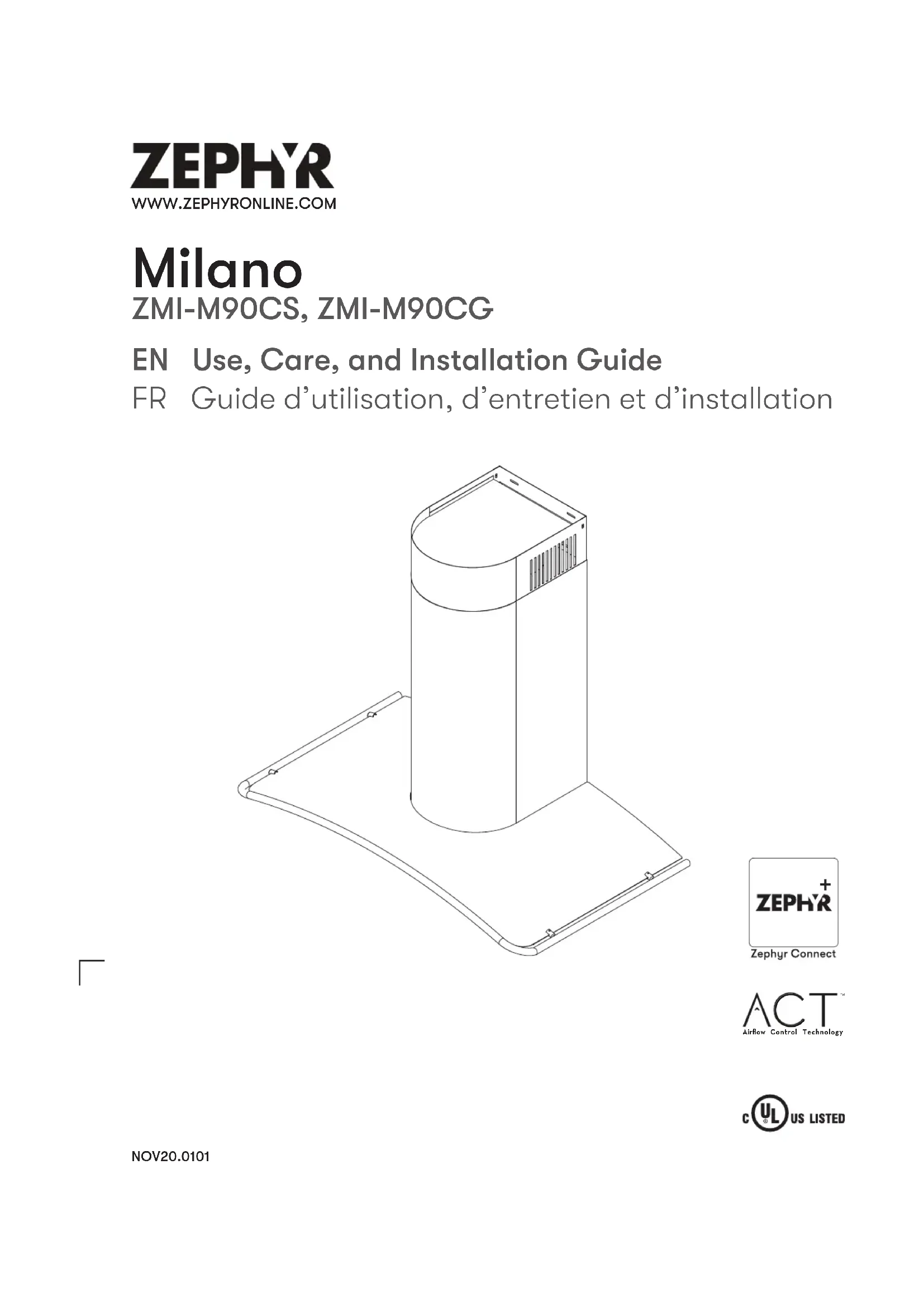 Modèle de capot Numéro d’article Quantité ZMI-M90CS 50200044 1 ZMI-M90CG 50200044 1 Pour commander des pièces, visitez-nous en ligne à http://store.zephyronline.com. FIG. F27 Milano Guide d’utilisation, d’entretien et d’installation ZEPHYRONLINE.COM Entretien LumiLight LED Dans le cas peu probable où votre LumiLight LED tombe en panne, veuillez contacter Zephyr pour commander des pièces de rechange.Voir la page de la liste des pièces et accessoires pour les numéros de pièces et les coordonnées.ĬĘĭė1. Retirez le filtre à mailles en aluminium.2. Retirez le panneau lumineux par deux vis.3. Débranchez le connecteur rapide de la lumière LED.4. Poussez les deux clips latéraux aux extrémités de la lumière LED.5. Poussez la lumière LED à travers l’ouverture du panneau lumineux. Poussez le clip FIG. G28 Milano Guide d’utilisation, d’entretien et d’installation MILANO MUR CORE Conversion ACT™ Ù¯ĠĬĻĭ Certains codes locaux limitent la quantité maximale de CFM qu’une hotte de cuisinière peut déplacer. ACT™ vous permet de contrôler le CFM maximum du ventilateur de certaines hottes de cuisinière Zephyr Ventilation sans avoir besoin de kits d’air d’appoint coûteux. ACT™ permet à l’installateur de régler facilement la vitesse maximale du ventilateur à l’un des trois niveaux CFM les plus couramment spécifiés; 590, 390 ou 290 CFM. L’utilisation d’ACT™ peut ne pas être nécessaire pour votre installation. Veuillez vérifier vos codes locaux pour les restrictions CFM.La hotte doit être débranchée de l’alimentation principale avant d’eectuer les instructions de conversion répertoriées ci-dessous. Ne pas le faire peut entraîner des blessures ou endommager le produit. AVERTISSEMENT Après avoir repositionné le cavalier et mis le capot sous tension, le CFM ne peut plus être changé. AVERTISSEMENT29 Milano Guide d’utilisation, d’entretien et d’installation ZEPHYRONLINE.COM Conversion ACT™ Activer ACT™ Pour activer ACT™: