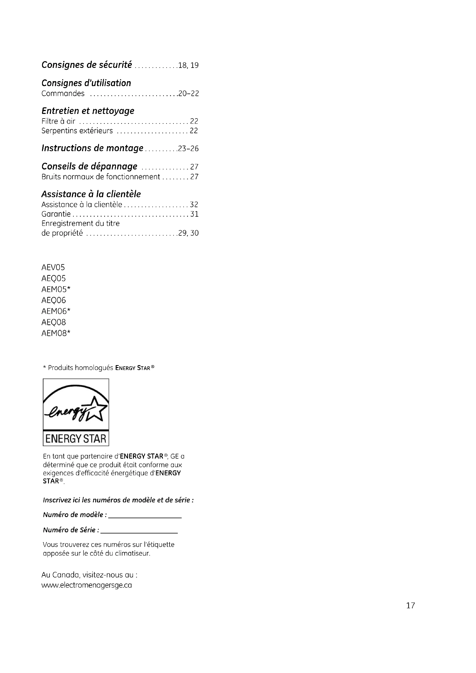 - autorisés. Pour obtenir le service, appelez le 1.800.561.3344. Veuillez fournir le numéro de série et le numéro de modèle lorsque vous appelez pour obtenir le service. Cette garantie est valable pour le premier propriétaire et tout autre propriétaire du produit s’il acheté au Canada pour utilisation domestique dans Canada. Le service à domicile sous garantie sera fourni là où il est disponible et dans les régions que Mabe considère que l’offre de service est raisonnable. Dans certaines provinces, il est interdit d’exclure ou de limiter les dommages directs ou indirects. Il est alors possible que les limitations ou exclusions ci-dessus ne s’appliquent pas dans votre cas. La présente garantie vous confère des droits juridiques spécifiques. Vous pouvez bénéficier d’autres droits, qui varient d’une province à l’autre. Pour connaître les droits dont vous bénéficiez dans votre province, communiquez avec le bureau des relations avec les consommateurs de votre région. Garant : Mabe Canada Inc., Burlington, Ontario n Les déplacements de service à votre maison pour vous apprendre à utiliser le produit. n Un montage, une livraison ou un entretien déficient. Si vous avez un problème de montage ou si le climatiseur n’a pas la bonne capacité de refroidissement pour son usage prévu, appelez votre revendeur ou votre installateur. Vous êtes responsable de fournir une installation de raccordement électrique convenable. n Les pannes occasionnées par des modifications au produit ou une utilisation non raisonnable, en particulier une absence d’entretien raisonnable et nécessaire. n Dans les emplacements commerciaux, la main- d’œuvre nécessaire pour déménager l’appareil jusqu’à un emplacement où il est accessible par un technicien particulier. n Le remplacement des fusibles de la maison ou la réactivation des disjoncteurs. n Les pannes occasionnées par la corrosion sur les modèles qui ne sont pas protégés contre la corrosion. n Les dommages occasionnés par un mauvais voltage de l’alimentation électrique, un accident, un incendie, une inondation ou une calamité naturelle. n Les dommages indirects et consécutifs à la propriété personnelle occasionnés par des vices possibles de ce climatiseur. n Les dommages occasionnés par la livraison. Ce qui n’est pas couvert : EXCLUSION DE GARANTIES IMPLICITES – Votre seul et unique recours est la réparation du produit selon les dispositions de cette Garantie limitée. Toutes les garanties implicites, incluant les garanties de commercialité et d’adéquation à un usage spécifique, sont limitées à une année ou à la période la plus courte autorisée par la législation.32 Assistance à la clientèle. Site Internet GE www.electromenagersge.ca Pour toute question ou pour un besoin d’assistance au sujet de votre appareil ménager, consultez le site Internet ci-dessus, accessible 24 heures par jour, chaque jour de l’année! À partir du site, vous pouvez télécharger les manuels d’utilisation. Studio de conception réaliste www.electromenagersge.ca Sur demande, GE peut fournir une brochure sur l’aménagement d’une cuisine pour les personnes à mobilité réduite. Écrivez: Directeur, Relations avec les consommateurs, Mabe Canada, Inc. Bureau 310, 1 Factory Lane Moncton, N.B. E1C 9M3 Pièces et accessoires www.electromenagersge.ca Ceux qui désirent réparer eux-mêmes leurs électroménagers peuvent recevoir pièces et accessoires directement à la maison (cartes VISA, MasterCard et Discover acceptées). Les procédures expliquées dans le présent manuel peuvent être exécutées par n’importe quel utilisateur. GE n’offre pas de services de réparation pour ce produit. Nous vous recommandons fortement de ne pas tenter de réparer vous-même le produit. Vous trouverez dans les pages jaunes de votre annuaire le numéro du Centre de service Mabe le plus proche. Autrement, appelez-nous au 1.800.561.3344. Contactez-nous www.electromenagersge.ca Si vous n’êtes pas satisfait du service après-vente dont vous avez bénéficié : Premièrement, communiquez avec les gens qui ont réparé votre appareil. Ensuite, si vous n’êtes toujours pas satisfait envoyez tous les détails—numéro de téléphone compris—au Directeur, Relations avec les consommateurs, Mabe Canada, Inc. Bureau 310, 1 Factory Lane Moncton, N.B. E1C 9M333 Instrucciones de seguridad p. 34
