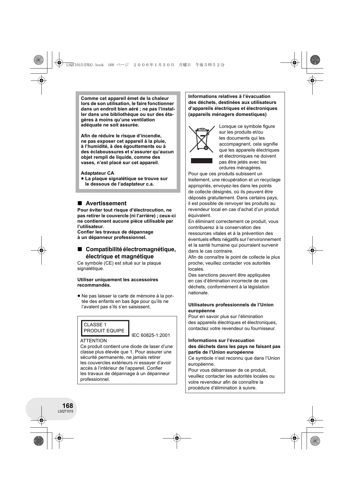 L’enregistrement de cassettes ou de disques pré-enregistrés ou d’autres contenus publiés ou diffusés, dans un but autre qu’une utilisation personnelle privée, peut enfreindre les lois sur les droits d’auteur. Même dans le cas d’une utilisation privée, l’enregistrement de certains contenus peut être restreint par la loi.