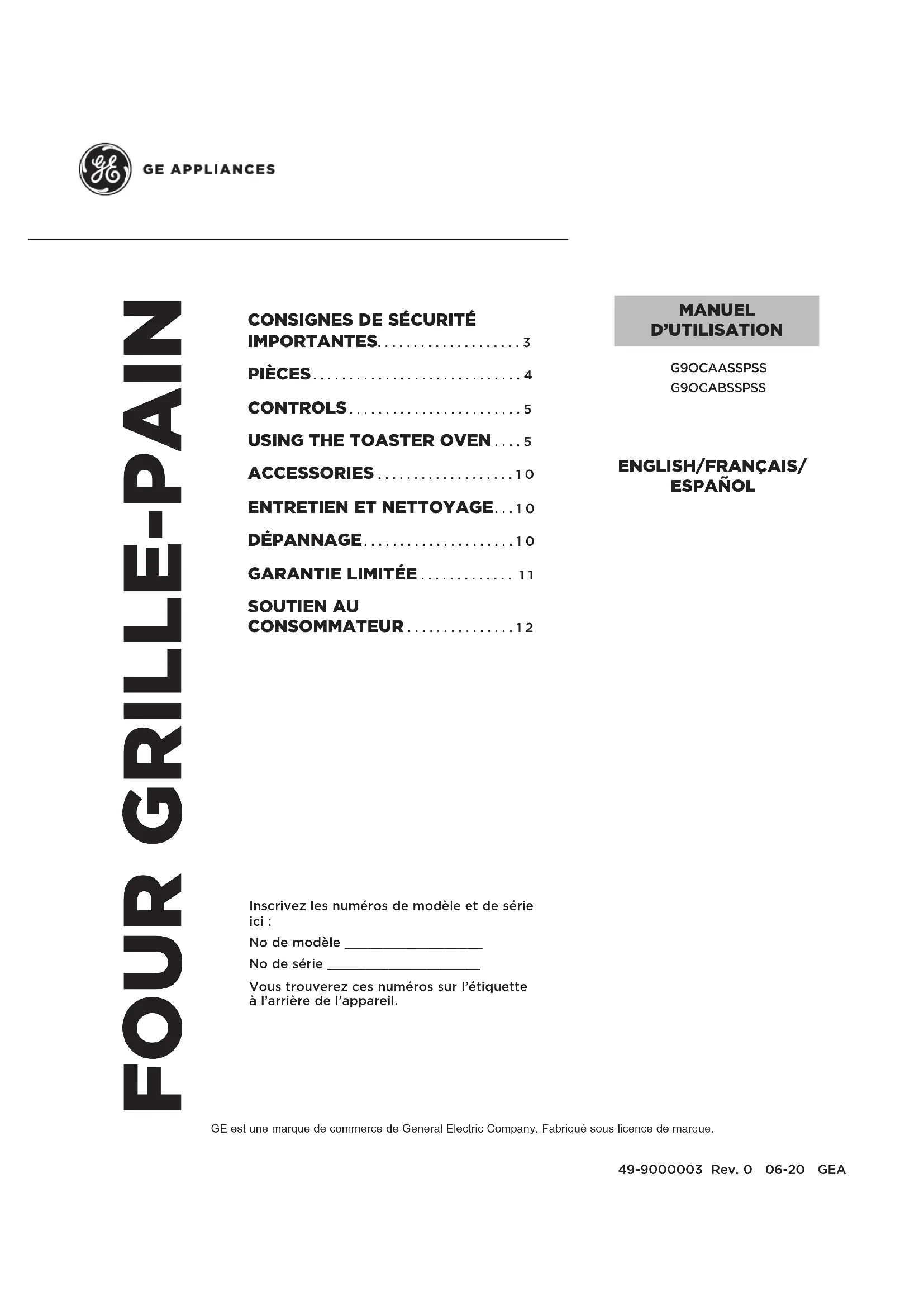 SOUTIEN AU CONSOMMATEUR ...............12 Inscrivez les numéros de modèle et de série ici : No de modèle __________________ No de série ____________________ Vous trouverez ces numéros sur l’étiquette à l’arrière de l’appareil. GE est une marque de commerce de General Electric Company. Fabriqué sous licence de marque. MANUEL D’UTILISATION2 49-9000003 Rev. 0 NOUS VOUS REMERCIONS D’INTÉGRER GE APPLIANCES À VOTRE DEMEURE. Que vous ayez grandi avec des électroménagers GE ou qu’il s’agisse de votre première acquisition, nous sommes heureux de vous accueillir dans notre famille. Nous sommes fiers du savoir-faire, de l’innovation et du design qui constituent chaque électroménager GE, et nous pensons que vous le serez aussi. Nous vous rappelons que l’enregistrement de votre électroménager vous assure de recevoir des renseignements importants sur le produit et la garantie lorsque vous en avez besoin.49-9000003 Rev. 0 3 ATTENTION Afin d’assurer une protection continuelle contre le risque de choc électrique, branchez l’appareil dans des prises correctement mises à la terre seulement Cet appareil est doté d’une fiche polarisée (une lame plus large que l’autre). Afin de réduire les risques d’électrocution, la fiche est conçue pour s’introduire dans la prise polarisée dans un sens seulement. Placez la fiche dans l’autre sens si elle refuse de s’introduire à fond dans la prise. S’il vous est toujours impossible d’insérer la fiche, contactez un électricien qualifié. Ne tentez pas de modifier la fiche de quelque façon que ce soit. ATTENTION