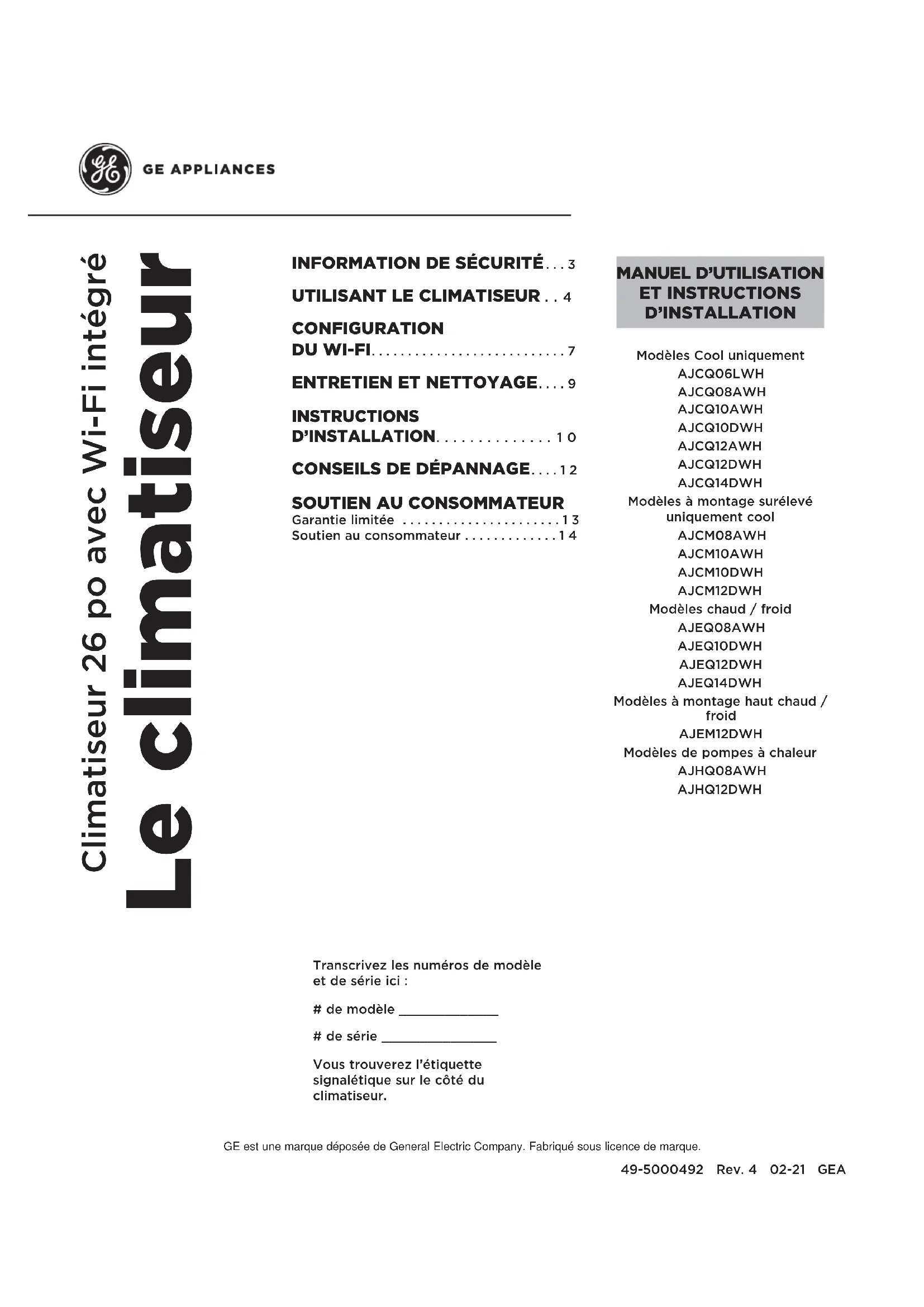 ET INSTRUCTIONS D’INSTALLATION Modèles Cool uniquement AJCQ06LWH AJCQ08AWH AJCQ10AWH AJCQ10DWH AJCQ12AWH AJCQ12DWH AJCQ14DWH Modèles à montage surélevé uniquement cool AJCM08AWH AJCM10AWH AJCM10DWH AJCM12DWH Modèles chaud / froid AJEQ08AWH AJEQ10DWH AJEQ12DWH AJEQ14DWH Modèles à montage haut chaud / froid AJEM12DWH Modèles de pompes à chaleur AJHQ08AWH AJHQ12DWH2 49-5000492 Rev. 4 NOUS VOUS REMERCIONS D’ACCUEILLIR GE APPLIANCES CHEZ VOUS Que vous ayez grandi avec GE Appliances ou qu’il s’agisse de votre première acquisition, nous sommes heureux de vous accueillir dans notre famille. Nous sommes fiers du savoir-faire, de l’innovation et de l’esthétique qui composent chaque appareil GE Appliances, et nous pensons que vous le serez aussi. Dans cette optique, nous vous rappelons que l’enregistrement de votre électroménager vous assure la communication de renseignements importants sur le produit et la garantie lorsque vous en avez besoin. Enregistrez votre électroménager GE en ligne dès maintenant. Des sites Web et des numéros de téléphone utiles figurent dans la section Soutien au consommateur de ce manuel d’utilisation.49-5000492 Rev. 4 3 Pour votre sécurité, vous devez suivre les instructions de ce manuel pour réduire les risques d’incendie, d’explosion, de choc électrique, de dommage à la propriété, de blessure ou de décès.Ŷ1¶XWLOLVH]FHWDSSDUHLOTXHSRXUVRQXVDJHSUpYXWHOque décrit dans le Manuel de l’utilisateur.Ŷ9RXVGHYH]ELHQPRQWHUFHFRQGLWLRQQHXUconformément aux Instructions de montage, avant de l’utiliser.Ŷ1HGpEUDQFKH]MDPDLVYRWUHFRQGLWLRQQHXUHQWLUDQWsur le cordon d’alimentation. Saisissez fermement la fiche et sortez-la droit de sa prise. Ŷ5HPSODFH]LPPpGLDWHPHQWWRXWFRUGRQG¶DOLPHQWDWLRQabîmé ou endommagé. Un cordon d’alimentation électrique endommagé ne doit pas être réparé mais plutôt remplacé par un autre cordon d’alimentation obtenu du fabricant. N’utilisez pas un cordon d’alimentation qui montre des fissures ou des signes d’abrasion sur sa longueur ou encore près de la prise ou du connecteur.ŶeWHLJQH]HWGpEUDQFKH]YRWUHFOLPDWLVHXUDYDQWGHprocéder à une réparation ou un nettoyage.Ŷ3RXUYRWUHVpFXULWp«QHUDQJH]MDPDLVRXQ¶XWLOLVH]MDPDLVGHVPDWpULDX[FRPEXVWLEOHVGHO¶HVVHQFHou d’autres vapeurs ou liquides inflammables à proximité de cet appareil ou de tout autre appareil électroménager. Ŷ6LODSULVHpOHFWULTXHQ¶HVWSDVFRPSDWLEOHDYHFODfiche du cordon électrique, il faut faire remplacer la prise par un électricien agréé. UTILISATION DE RALLONGESRISQUE D’INCENDIE. Peut occasionner des blessures graves ou la mort.Ŷ1(3$6XWLOLVHUGHUDOORQJHDYHFFHFRQGLWLRQQHXUd’air.Ŷ1(3$6XWLOLVHUGHSDUDVXUWHQVHXURXG¶DGDSWDWHXUjprises multiples avec ce conditionneur d’air.