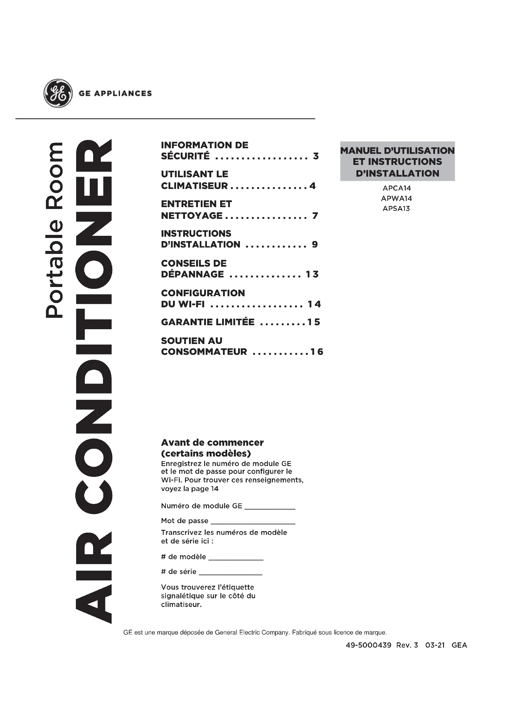 ET INSTRUCTIONS D’INSTALLATION Transcrivez les numéros de modèle et de série ici : # de modèle _____________ # de série _______________ Vous trouverez l’étiquette signalétique sur le côté du climatiseur. GE est une marque déposée de General Electric Company. Fabriqué sous licence de marque.2 49-5000439 Rev. 3 NOUS VOUS REMERCIONS D’ACCUEILLIR GE APPLIANCES CHEZ VOUS Que vous ayez grandi avec GE Appliances ou qu’il s’agisse de votre première acquisition, nous sommes heureux de vous accueillir dans notre famille. Nous sommes fiers du savoir-faire, de l’innovation et de l’esthétique qui composent chaque appareil GE Appliances, et nous pensons que vous le serez aussi. Dans cette optique, nous vous rappelons que l’enregistrement de votre électroménager vous assure la communication de renseignements importants sur le produit et la garantie lorsque vous en avez besoin. Enregistrez votre électroménager GE en ligne dès maintenant. Des sites Web et des numéros de téléphone utiles figurent dans la section Soutien au consommateur de ce manuel d’utilisation.49-5000439 Rev. 3 3