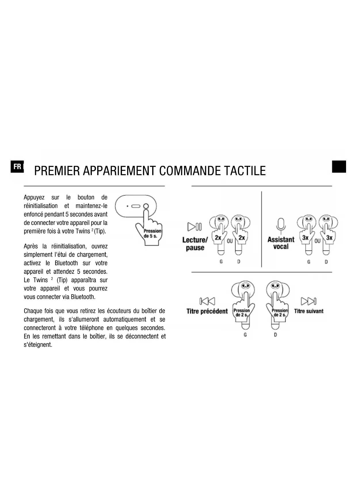 (Tip). Après la réinitialisation, ouvrez simplement l'étui de chargement, activez le Bluetooth sur votre appareil et attendez 5 secondes. Le Twins