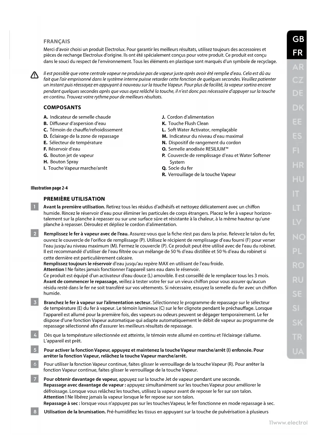 1 Avant la première utilisation. Retirez tous les résidus d’adhésifs et nettoyez délicatement avec un chion humide. Rincez le réservoir d’eau pour éliminer les particules de corps étrangers. Placez le fer à vapeur horizon- talement sur la planche à repasser ou sur une surface sûre et résistante à la chaleur, à la même hauteur qu’une planche à repasser. Déroulez et dépliez le cordon d’alimentation. 2 Remplissez le fer à vapeur avec de l’eau. Assurez-vous que la che n’est pas dans la prise. Relevez le talon du fer, ouvrez le couvercle de l’orice de remplissage (P). Utilisez le récipient de remplissage d’eau fourni (F) pour verser l’eau jusqu’au niveau maximum (M). Fermez le couvercle (P). Ce produit peut être utilisé avec de l’eau du robinet. Il est recommandé d’utiliser de l’eau ltrée ou un mélange de 50% d’eau distillée et 50% d’eau du robinet si cette dernière est particulièrement calcaire. Remplissez toujours le réservoir d’eau jusqu’au repère MAX en utilisant de l’eau froide. Attention! Ne faites jamais fonctionner l’appareil sans eau dans le réservoir. Ce produit est équipé d’un activateur d’eau douce (L) amovible. Il est conseillé de le remplacer tous les 3 mois. Avant de commencer le repassage, veillez à tester votre fer sur un vieux chion pour vous assurer qu’aucun résidu resté dans le fer ne soit transféré sur vos vêtements. Si nécessaire, essuyez la semelle du fer avec un chion humide. 3 Branchez le fer à vapeur sur l’alimentation secteur. Sélectionnez le programme de repassage sur le sélecteur de température (E) du fer à vapeur. Le témoin lumineux (C) sur le fer clignote pendant le préchauage. Lorsque l’appareil est allumé pour la première fois, des vapeurs ou odeurs peuvent se dégager temporairement. Le fer dispose d’une fonction Vapeur automatique qui adapte automatiquement le débit de vapeur au programme de repassage sélectionné an d’assurer les meilleurs résultats de repassage. 4 Dès que la température sélectionnée est atteinte, le témoin reste allumé en continu et l’éclairage s’allume. L’appareil est prêt. 5 Pour activer la fonction Vapeur, appuyez et maintenez la touche Vapeur marche/arrêt (I) enfoncée. Pour arrêter la fonction Vapeur, relâchez la touche Vapeur marche/arrêt. 6 Pour utiliser la fonction Vapeur continue, faites glisser le verrouillage de la touche Vapeur (R). Pour arrêter la fonction Vapeur continue, faites glisser le verrouillage de la touche Vapeur. 7 Pour obtenir davantage de vapeur, appuyez sur la touche Jet de vapeur pendant une seconde. Repassage avec davantage de vapeur: appuyez simultanément sur les touches Vapeur pour améliorer le défroissage. Lorsque vous relâchez les touches, utilisez la vapeur avant de reposer le fer sur son talon. Attention! Ne libérez jamais la vapeur lorsque le fer repose sur son talon. Repassage à sec: lorsque vous n’appuyez pas sur les touches Vapeur, le fer fonctionne en mode repassage à sec. 8 Utilisation de la brumisation. Pré-humidiez les tissus en appuyant sur la touche de pulvérisation à plusieurs12 www.electrolux.com reprises pour libérer une ne brumisation; veillez à ce que le réservoir soit au moins à moitié plein. 9 Repassage à la vapeur d’articles suspendus. La fonction Vapeur verticale est idéale pour les rideaux et les costumes. Tenez le fer à une distance de 10 à 20cm et appuyez sur la touche Jet de vapeur. 10 Le fer est équipé d’une fonction d’arrêt automatique à 3modes. Si vous laissez le fer sans surveillance sur la semelle ou sur le côté, il s’éteint automatiquement au bout de 30secondes. Si vous le laissez sans surveillance sur le talon, il s’éteint automatiquement au bout de 8minutes. Pour rallumer le fer, il sut de le bouger. Avant de s’éteindre de lui-même, le fer émettra un petit « bip ». Pour réactiver le fer, bougez-le brièvement. Il fonctionne alors à nouveau. 11 Pour mettre le fer à vapeur hors tension, tournez le sélecteur de température sur la position 0. Un court bip sonore est émis et tous les voyants s’éteignent. Débranchez la che de la prise secteur. Ne tirez jamais sur le câble d’alimentation. À la place, saisissez la che et tirez dessus. Videz le réservoir d’eau et laissez le fer refroidir complètement avant de le ranger. 12 Lorsque vous rangez le fer, posez-le toujours sur son talon, avec le câble enroulé autour du dispositif prévu à cet eet, sans trop le serrer. Pour nettoyer les surfaces extérieures, utilisez un chion doux humide et séchez en essuyant. N’utilisez pas de solvants chimiques: ils pourraient en eet endommager la surface. NETTOYAGE (N’UTILISEZ AUCUN DÉTERGENT) 13 Flush Clean (K) Remplissez le réservoir d’eau jusqu’au repère maximum (M) et sélectionnez le programme « Linen » (Lin). Lorsque l’éclairage clignote, débranchez le fer. Tenez le fer au-dessus d’un évier et appuyez sur la touche Flush Clean (K). Utilisez un réservoir d’eau plein. Relâchez la touche pour arrêter la fonction Flush Clean. Répétez l’opération si nécessaire. REMARQUE : N’UTILISEZ PAS DE LIQUIDE DE DÉTARTRAGE, DE VINAIGRE OU D’ACIDE CITRIQUE ! 14 L’utilisation de l’activateur d’eau douce (L) est recommandée juste après la fonction Flush Clean. Ouvrez le couvercle de remplissage d’eau (P) et sortez l’activateur d’eau douce (L) pour le mettre au rebut. Remplacez-le par le nouveau système adoucisseur d’eau Electrolux EDC03/900923064. Associés, la fonction Flush Clean et le système adoucisseur d’eau assurent une vapeur propre et douce pour de meilleurs résultats de repassage et une durée de vie accrue de votre fer à vapeur. 15 Nettoyage de la semelle (O). Pour enlever les résidus brûlés, passez le fer sur un chion humide tandis qu’il est encore chaud. Pour garder la semelle lisse, évitez tout contact avec des objets métalliques. N’utilisez jamais d