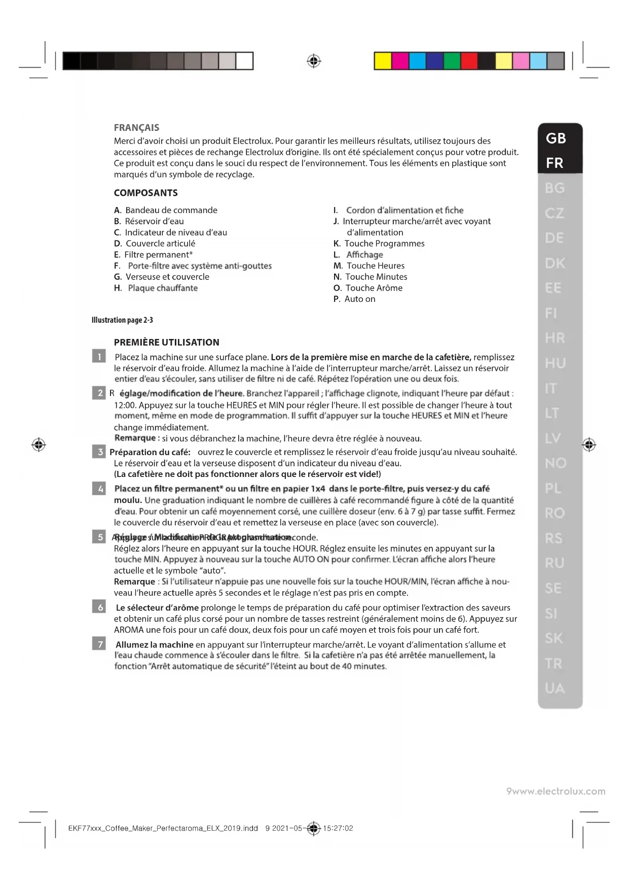 moulu. le couvercle du réservoir d’eau et remettez la verseuse en place (avec son couvercle). 5 Appuyez sur la touche PROGRAM plus d’une seconde. Réglez alors l’heure en appuyant sur la touche HOUR. Réglez ensuite les minutes en appuyant sur la actuelle et le symbole “auto”. Remarque veau l’heure actuelle après 5 secondes et le réglage n’est pas pris en compte. 6 Le sélecteur d’arôme prolonge le temps de préparation du café pour optimiser l’extraction des saveurs et obtenir un café plus corsé pour un nombre de tasses restreint (généralement moins de 6). Appuyez sur AROMA une fois pour un café doux, deux fois pour un café moyen et trois fois pour un café fort. 7 Allumez la machine en appuyant sur l’interrupteur marche/arrêt. Le voyant d’alimentation s’allume et EKF77xxx_Coffee_Maker_Perfectaroma_ELX_2019.indd 9 2021-05-21 15:27:0210 www.electrolux.com 8 Lorsque la verseuse est retirée, le système anti-gouttes empêche le café de goutter sur la plaque chauf- fante. risquerait de déborder.)