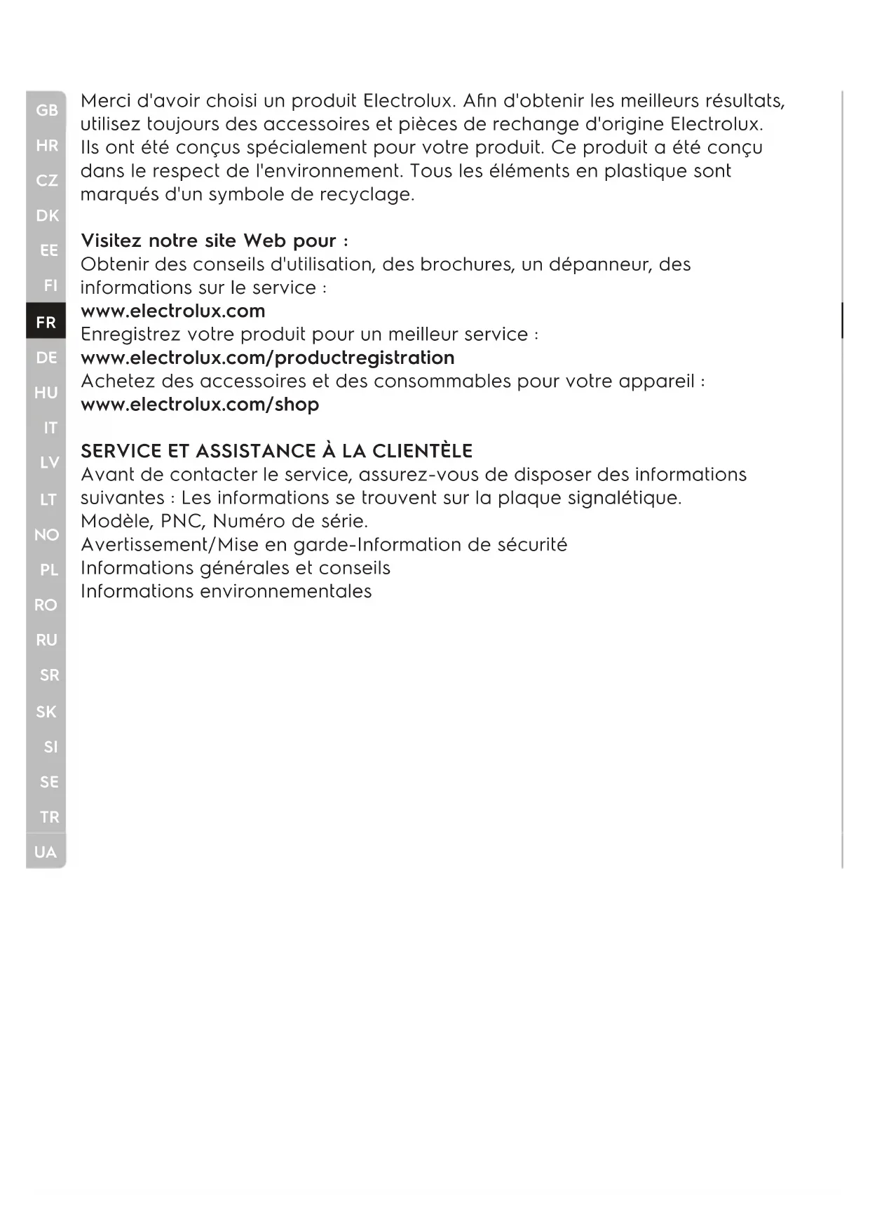 Merci d'avoir choisi un produit Electrolux. Afin d'obtenir les meilleurs résultats, utilisez toujours des accessoires et pièces de rechange d'origine Electrolux. Ils ont été conçus spécialement pour votre produit. Ce produit a été conçu dans le respect de l'environnement. Tous les éléments en plastique sont marqués d'un symbole de recyclage. Visitez notre site Web pour : Obtenir des conseils d'utilisation, des brochures, un dépanneur, des informations sur le service : www.electrolux.com Enregistrez votre produit pour un meilleur service : www.electrolux.com/productregistration Achetez des accessoires et des consommables pour votre appareil : www.electrolux.com/shop
